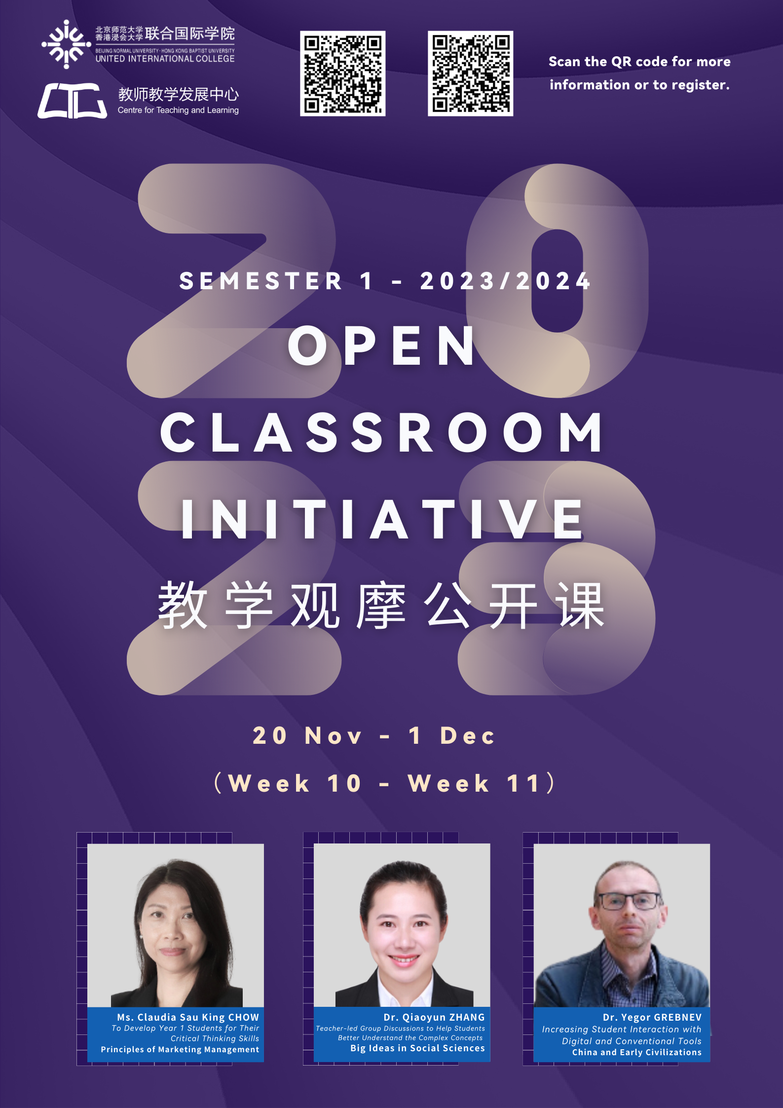 | Open Classroom Title: Teacher-led Group Discussions to Help Students Better Understand the Complex Concepts Open Classroom Type: Physical Classroom Course Title: Big Ideas in Social Sciences Course Type: Major Required Course, Year 1 Date & Time: 21 Nov 2023, 16:00 – 17:50 Description: 1). Teacher's language use: if the language is too difficult, or if the teacher speaks too fast or too slow; 2). Discussion questions in class: if the questions are good ones to provoke student participation and understanding. |