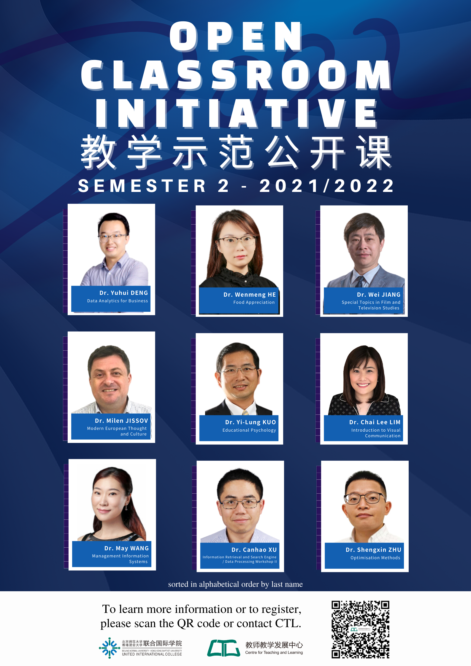To promote teaching excellence at UIC, CTL has launched ‘Open Classroom Initiative’ (OCI), which provides our colleagues a safe space to learn and develop innovative and technological pedagogical practices from the exemplary colleagues who have demonstrated teaching excellence in their courses. If you would like to observe the participating courses (see below), please register and choose the available timeslot in advance. After receiving the registration, CTL will inform the course instructors and participants via email. Participants can apply for a meal card of Changsheng Restaurant (100 yuan/person/semester) to have meals with instructors for further communication.