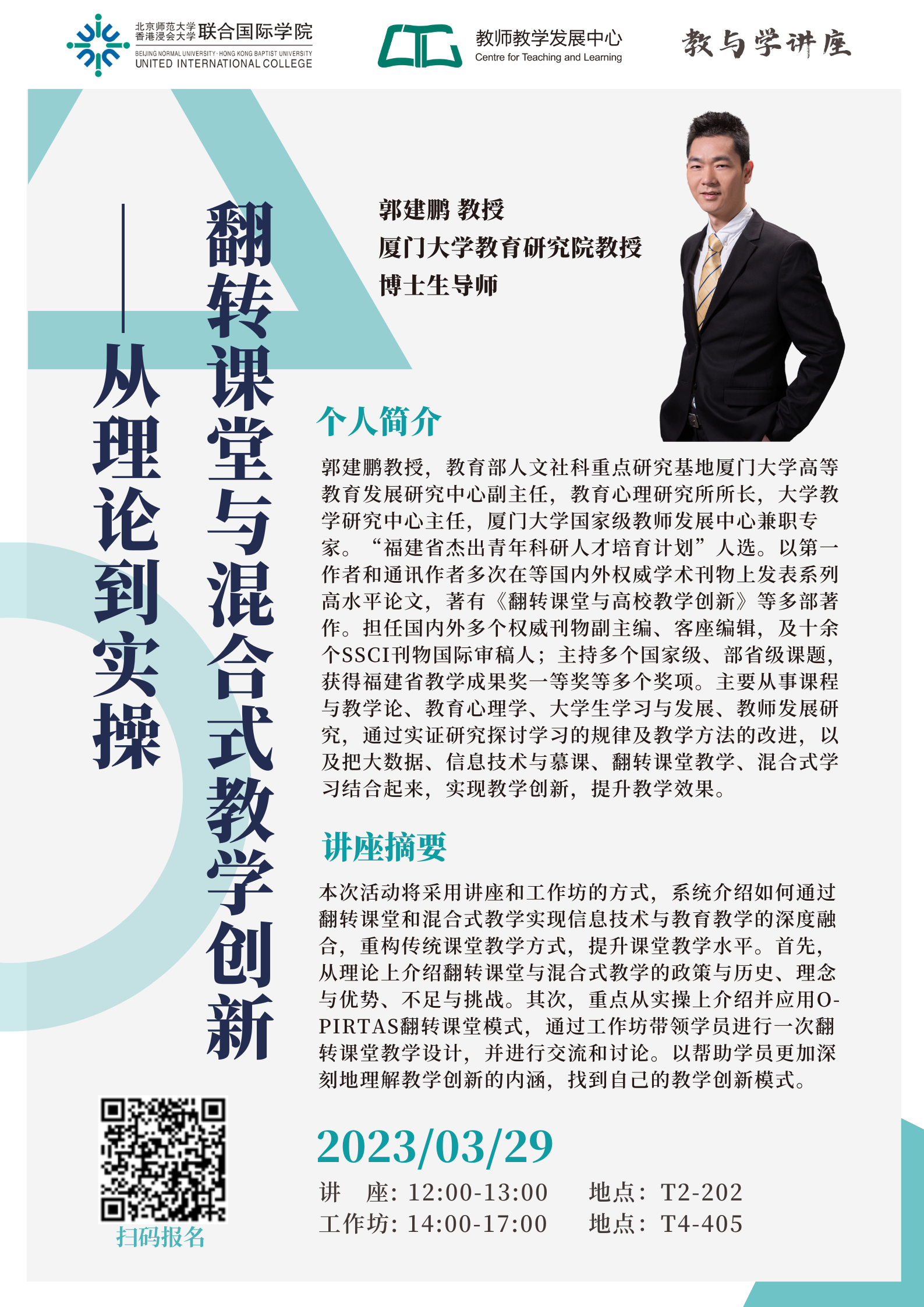 Abstract: 本次活动将采用讲座和工作坊的方式,系统介绍如何通过翻转课堂和混合式教学实现信息技术与教育教学的深度融合,重构传统课堂教学方式,提升课堂教学水平。首先,从理论上介绍翻转课堂与混合式教学的政策与历史、理念与优势、不足与挑战。其次,重点从实操上介绍并应用O-PIRTAS翻转课堂模式,通过工作坊带领学员进行一次翻转课堂教学设计,并进行交流和讨论。以帮助学员更加深刻地理解教学创新的内涵,找到自己的教学创新模式。