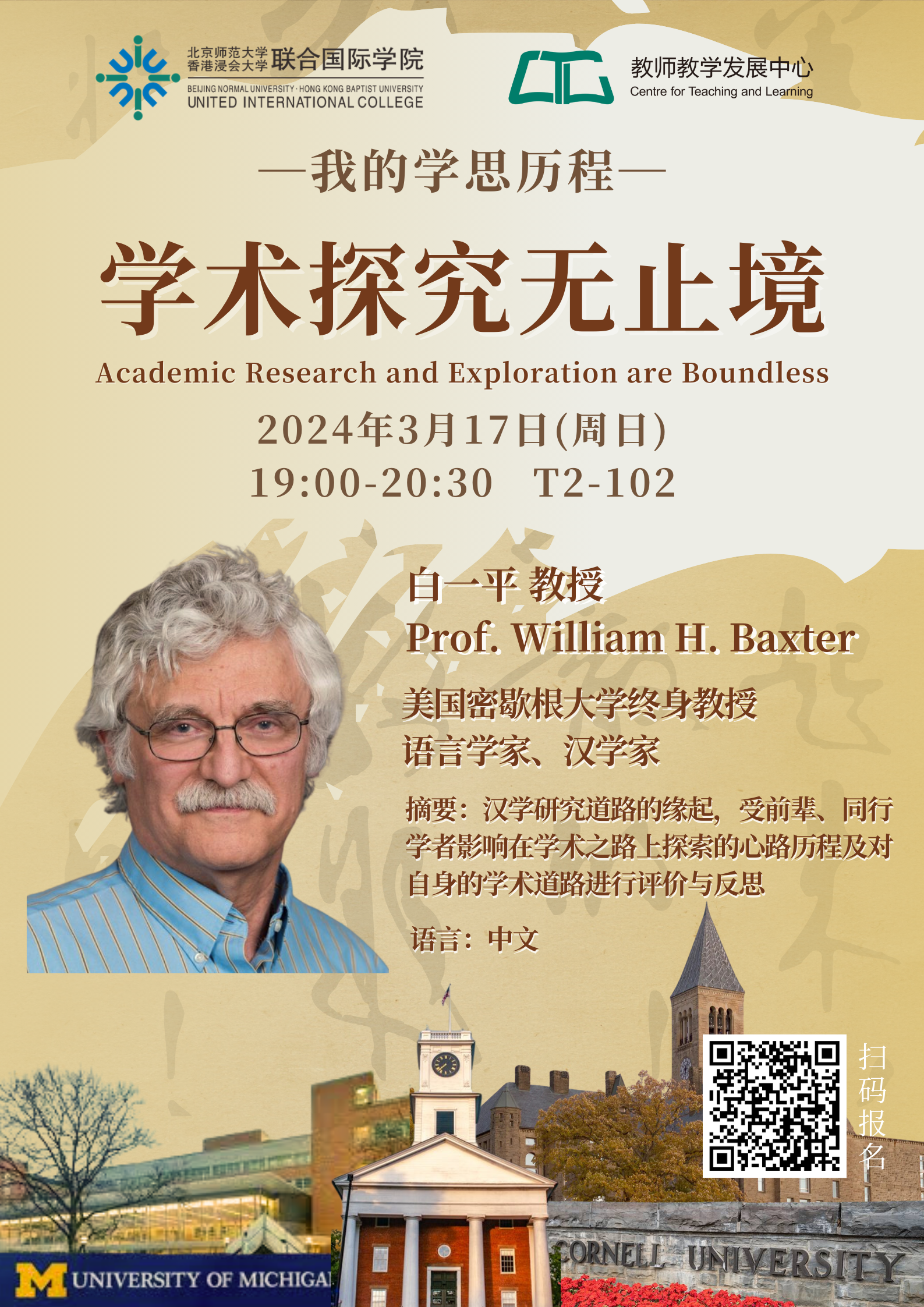 The lecture will share the origin of Prof. Baxter's path to Chinese linguistics research, discuss his journey of exploring the academic path influenced by his predecessors and fellow scholars, and evaluate and reflect on his own academic path.
