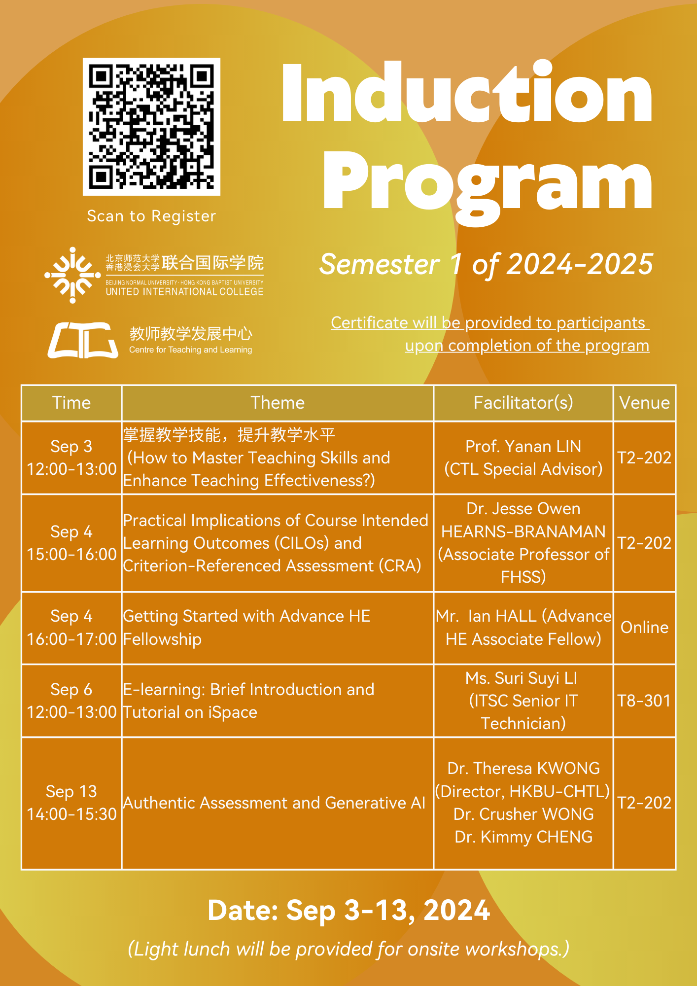 We are pleased to announce that the Induction Program for all new teaching staff members, including teaching support staff, joining UIC during the Academic Year 2024-2025 is launched. The aim of this program is to help new colleagues become familiar with outcomes-based teaching and learning, strategies for digital learning and teaching, pedagogical knowledge, and teaching support at UIC.