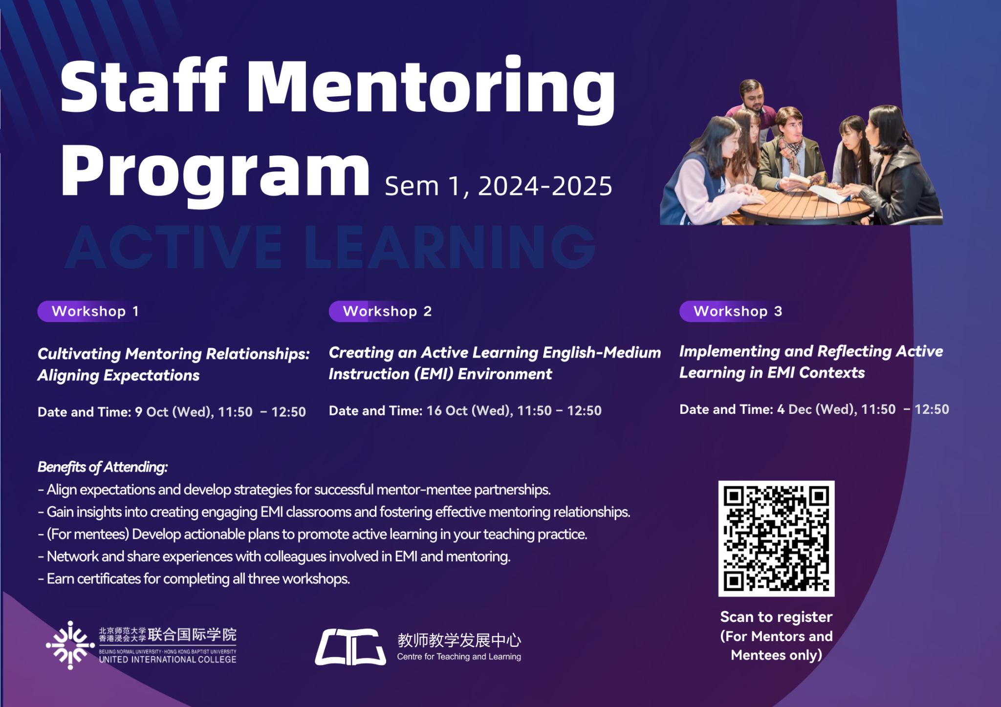 Furthermore, three Staff Mentoring Workshops are scheduled to provide you with valuable insights into creating engaging English-Medium Instruction (EMI) classrooms and fostering effective mentoring relationships: