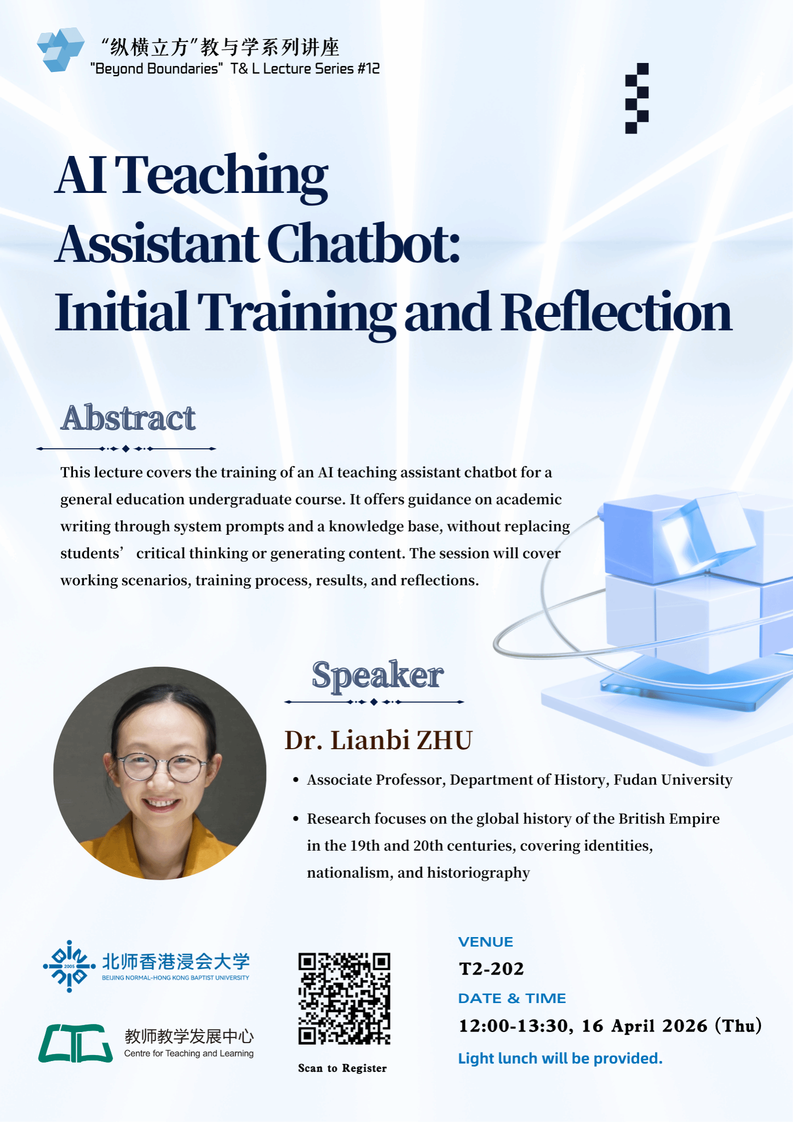 This lecture will focus on how I trained an AI teaching assistant chatbot for a general education course offered to undergraduate students from various majors. This chatbot provides guidance on academic paper writing by accessing system prompts and a knowledge base, while not replacing student’s critical thinking or directly generating content for them. The lecture will share the working scenarios, training process, application results, and reflections on the AI teaching assistant chatbot.