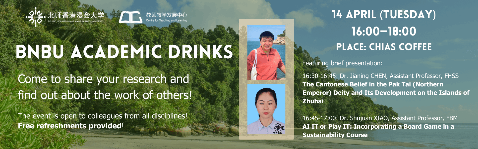 Our Academic Drinks event series is dedicated to the promotion of friendship and cooperation among faculty members working at different departments. Whether you have only recently joined BNBU or have been with us for a while, it is a good chance to meet new friends or catch up with colleagues, and talk about your research and teaching experiences! Please join us for an afternoon of friendly conversations over delicious drinks and snacks.