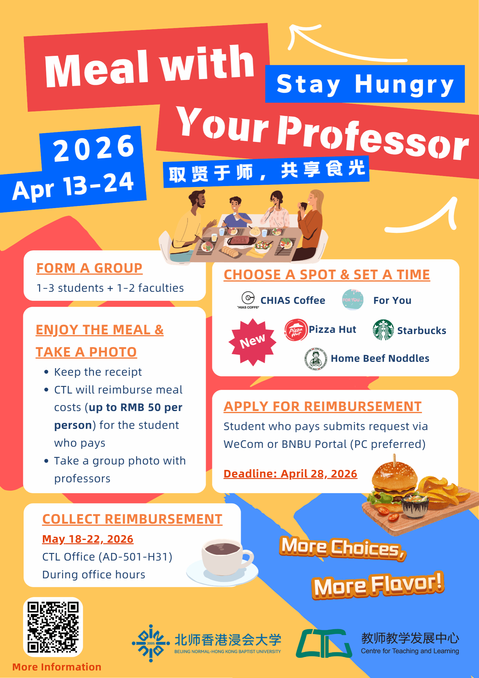 由教师教学发展中心(CTL)主办的「取贤于师,共享食光」将于 2026年4月13日(周一)至4月24日(周五) 开放,欢迎同学们踊跃参与。