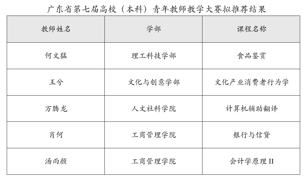 Results of the Recommendation of the 7th Guangdong Teaching Contest for Young Teachers 关于参加广东省第七届高校(本科)青年教师教学大赛拟推荐结果的公示