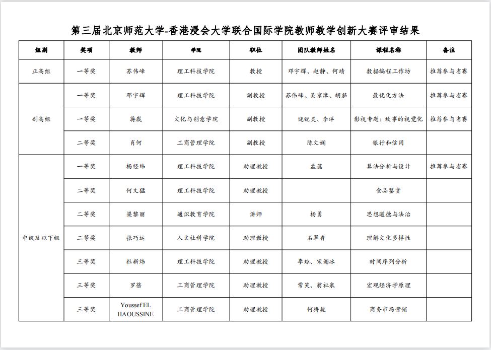 近日,北师港浸大(UIC)第三届教师教学创新大赛(以下简称校赛)赛果出炉。来自四个学院的11支参赛教师团队分别参加正高组、副高组和中级及以下组别比赛,4支脱颖而出的队伍将代表UIC参加第三届全国高校教师教学创新大赛广东分赛暨广东省高校教师教学创新大赛。