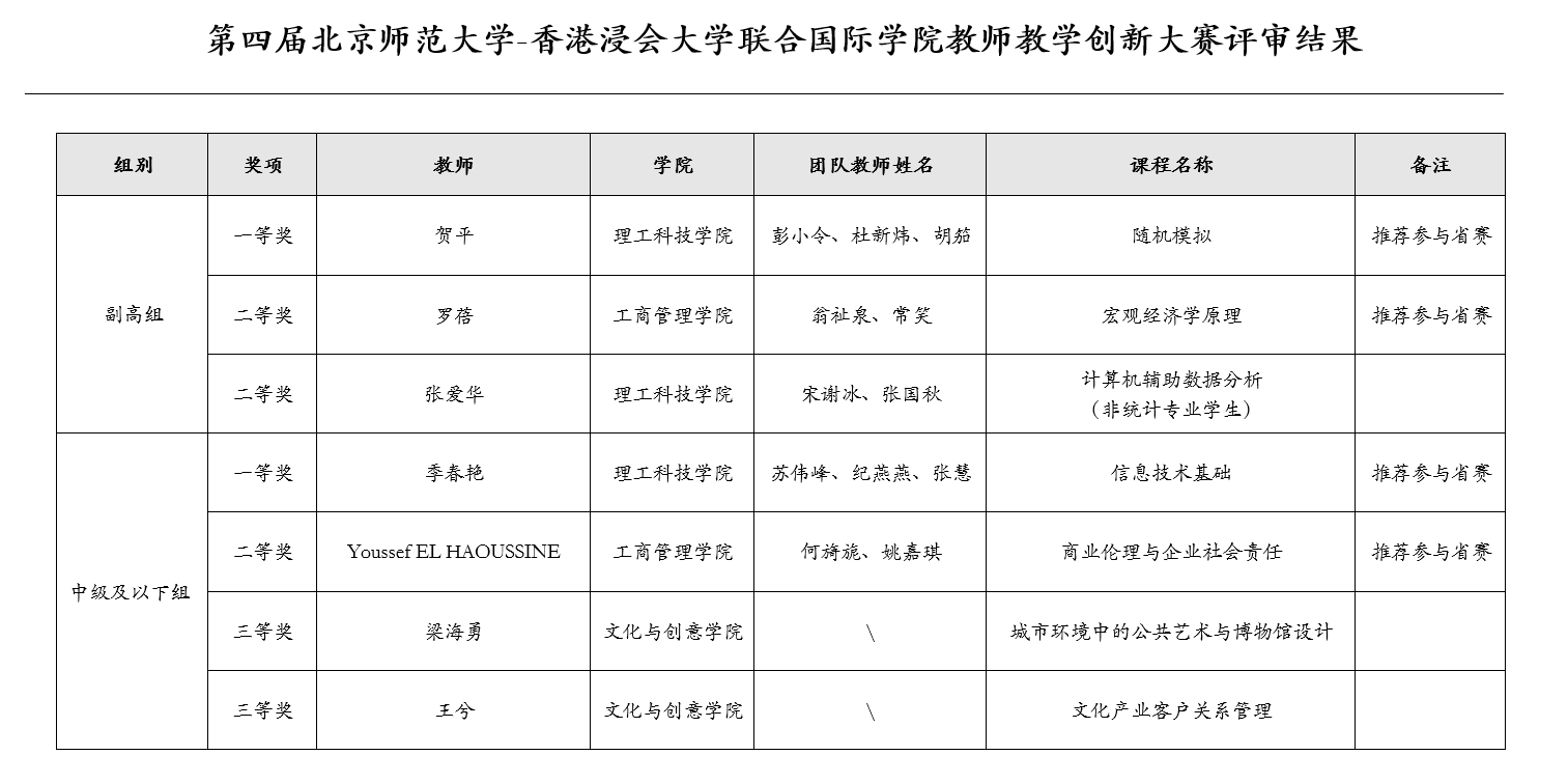 Results of the 4th UIC Innovative Teaching Contest 关于第四届北京师范大学-香港浸会大学联合国际学院教师教学创新大赛评审最终结果通知