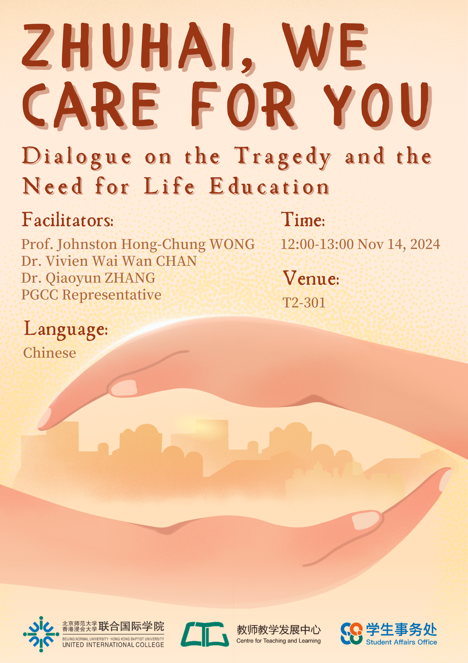 The tragedy at Xiangzhou District Sports Center in Zhuhai on November 11th has left us all deeply shocked and saddened. In these difficult times, our care and support for one another are especially important. We are not only classmates and colleagues to each other, but also listeners and solaces in each other's lives. In spirit of caring, we will organize a dialogue tomorrow. We hope you can join us in discussing how to provide support for those affected, and how to deepen our understanding of life education through this event.