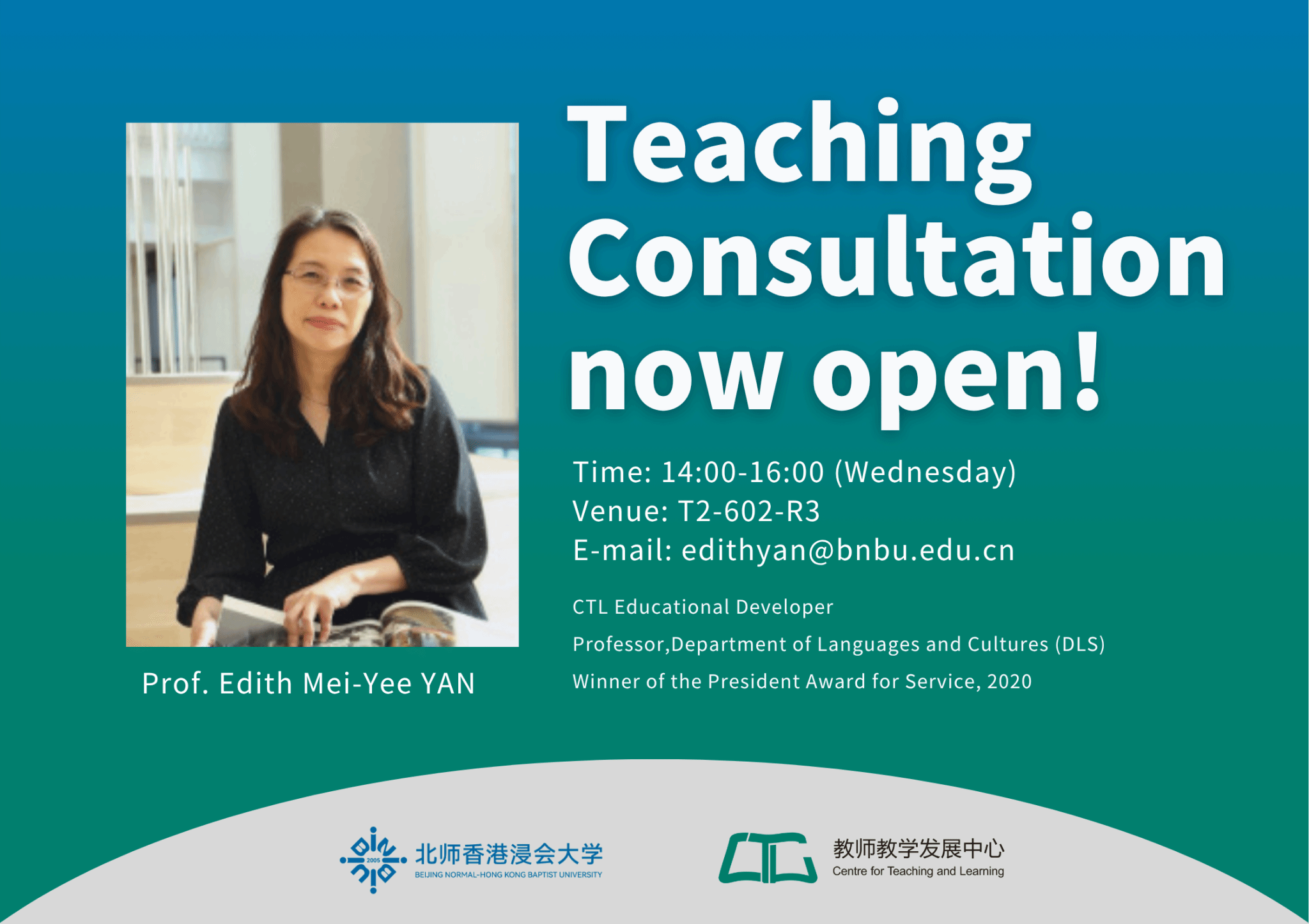 Prof. Edith Yan, Educational Developer at the CTL, welcomes colleagues to drop by for a chat or consultation on