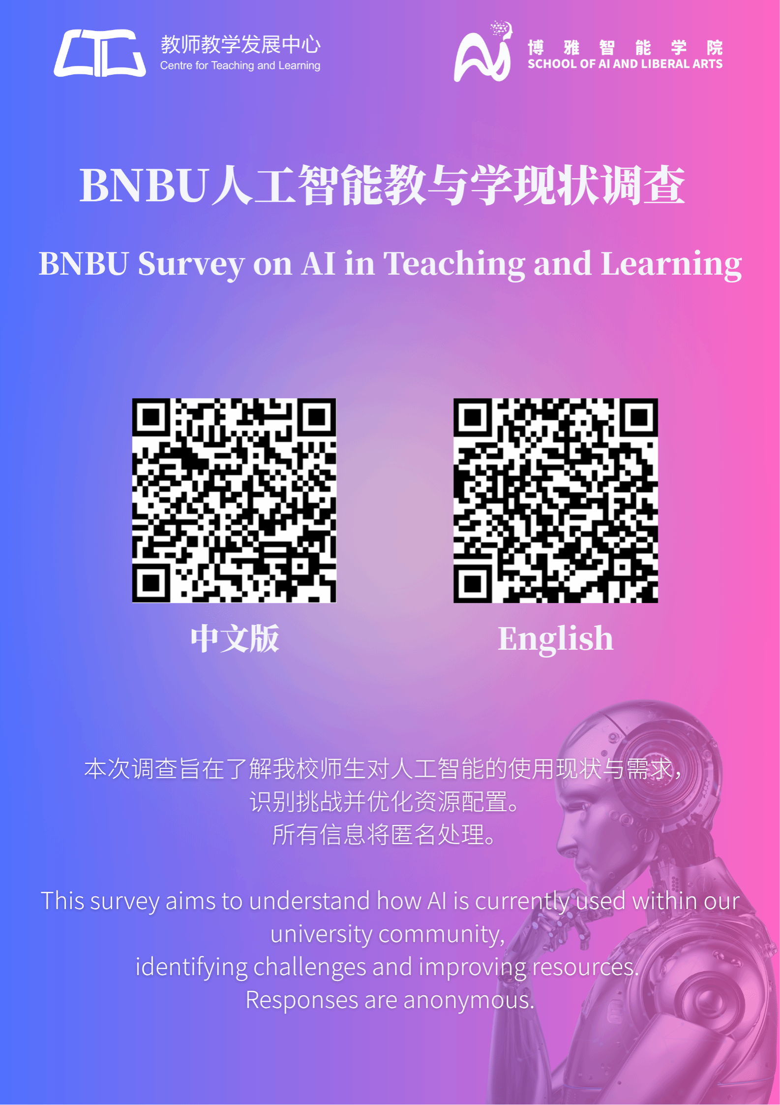 This survey aims to understand how AI is currently used within our university community, identify key challenges, and clarify the gap between existing practices and university-provided resources. Your feedback is vital in helping BNBU improve teaching support services, enhance training programs, and optimize resource allocation, thereby fostering the integration of technology in education in line with the university’s mission to cultivate high-quality, innovative talent.