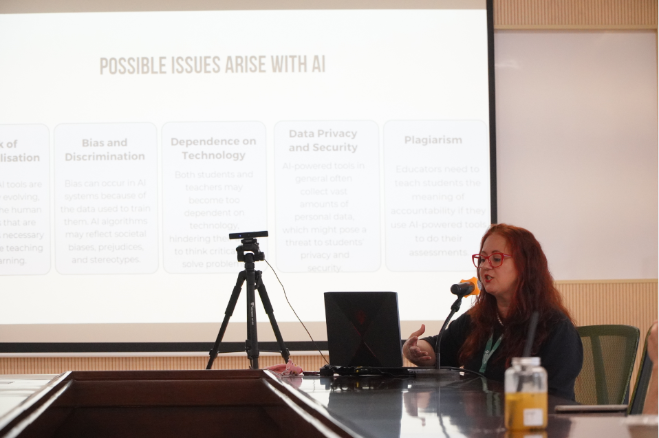 Ms. CERVERA shared her opinions on EdTech and AI in higher education and tips on employing technology and AI in the teaching process. According to Ms. CERVERA, EdTech facilitates a more convenient education environment and provide new learning methods for both teachers and students. AI is also beneficial to students in terms of conversation and writing practice, vocabulary development, and grammar instruction. However, it may also pose some issues – plagiarism using AI and bias and discrimination occur in answers given by AI are two of the most typical examples.