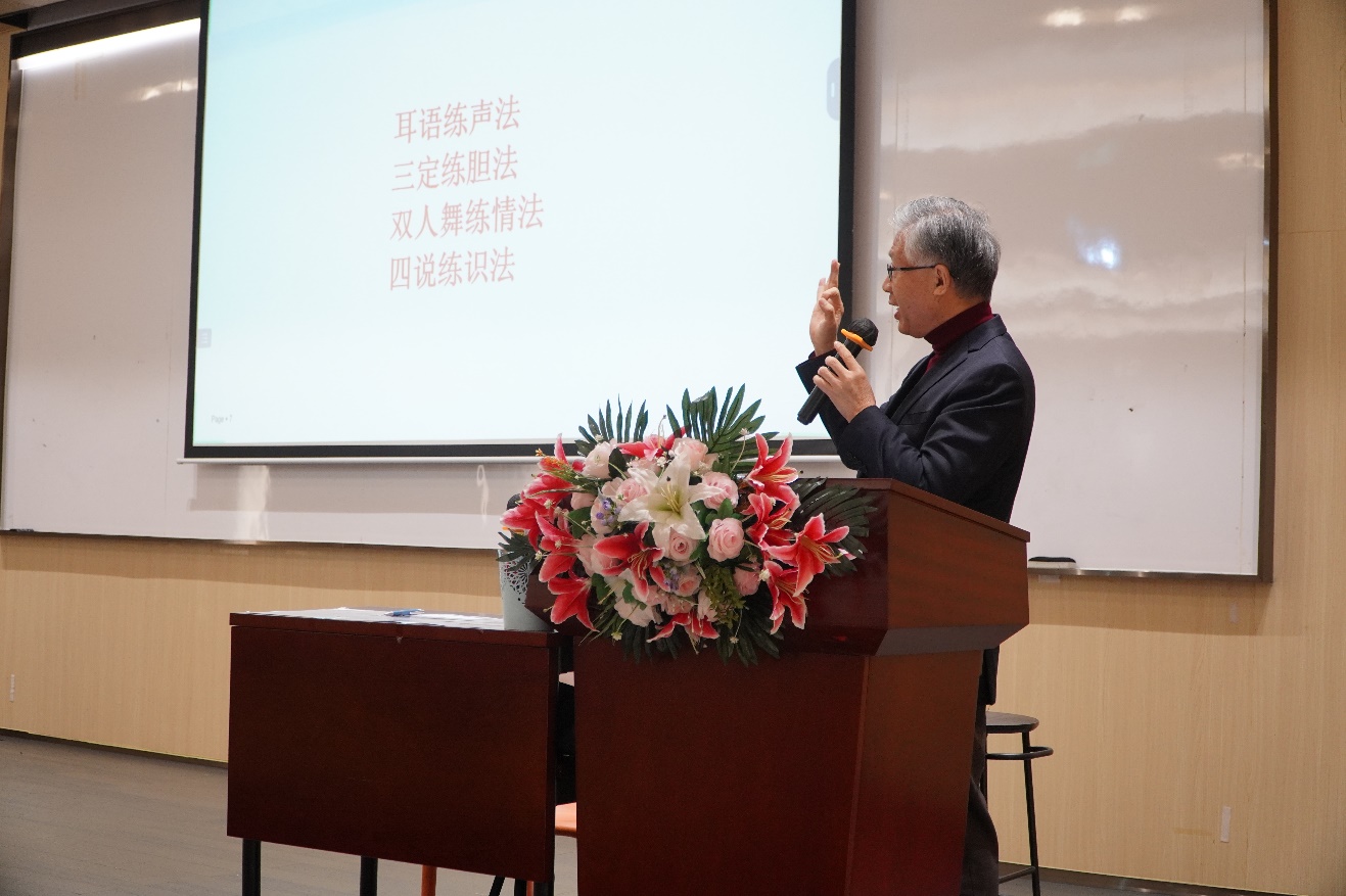 活动接近尾声时,殷亚敏教授总结了今天的演讲内容,并耐心地回答了同学们提出的问题。在被问及“如何发现用悄悄话练习的方法?”殷教授结合自己在珠海做教师讲课的经历,讲述了自己如何了解到传统广播电视播音主持课中的胸肺联合呼吸方法,并加以改良使其通俗易懂,从此新的这种方法就贯穿了他的教学生涯。在谈论“先写好稿子再背是否适合经常演讲的人?”的问题时,他表示:只要演讲人时间允许,都要按照先写好稿子再背诵的方式准备。通过这种方式可以让演讲者的技能不断熟练,随之写稿的时间也逐渐减少,最终达到一个只需要列出提纲就可以完成连贯地演讲的状态。只有通过写,读,背才可以出口成章。