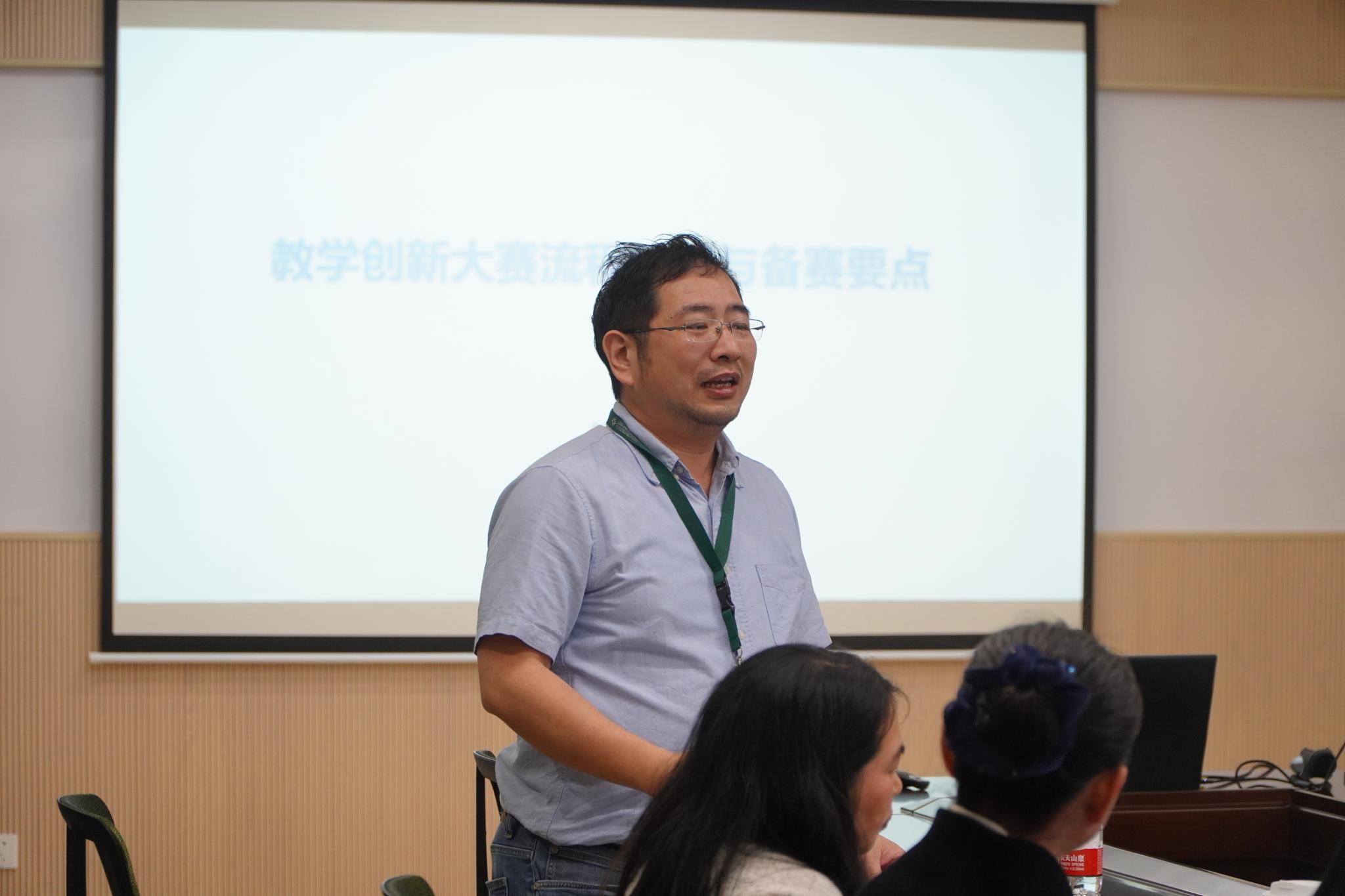 郭奕龙博士做动员讲话,他指出我校在第三届广东省教师教学创新大赛中取得突破,充分展示了我校教师认真负责的教学态度和杰出的教学能力,希望这今年我校教师能积极参赛,准确把握竞赛要点,总结凝练教学成果,积极探索教育教学新思路和新方法,在比赛中获得优异成绩。