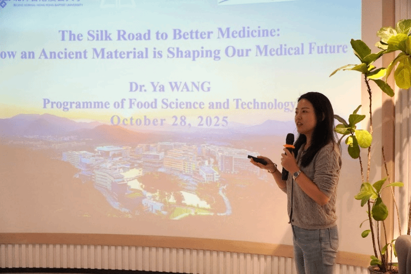 Dr. Aimee Ya WANG, Associate Professor of the Faculty of Science and Technology (FST), delivered a presentation titled "The Silk Road to Better Medicine: How an Ancient Material is Shaping Our Medical Future." She introduced the structure, properties, and extraction of silkworm (Bombyx mori), as well as its innovative applications in modern biomedical engineering.