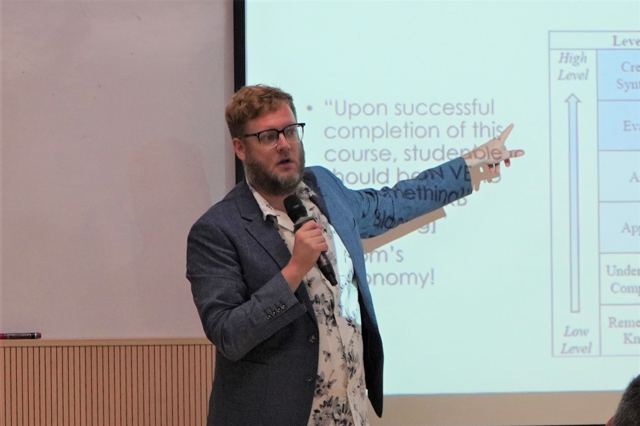人文社科学院副教授Dr. Jesse Owen Hearns-Branaman主持了关于“课程预期学习成果与标准参照评估的实践应用”工作坊。该工作坊聚焦课程设计的关键环节,包括如何制定相关的课程预期学习成果(CILOs)、有效安排评估时间,以及制定高质量的评分标准,确保评分的一致性与客观性。