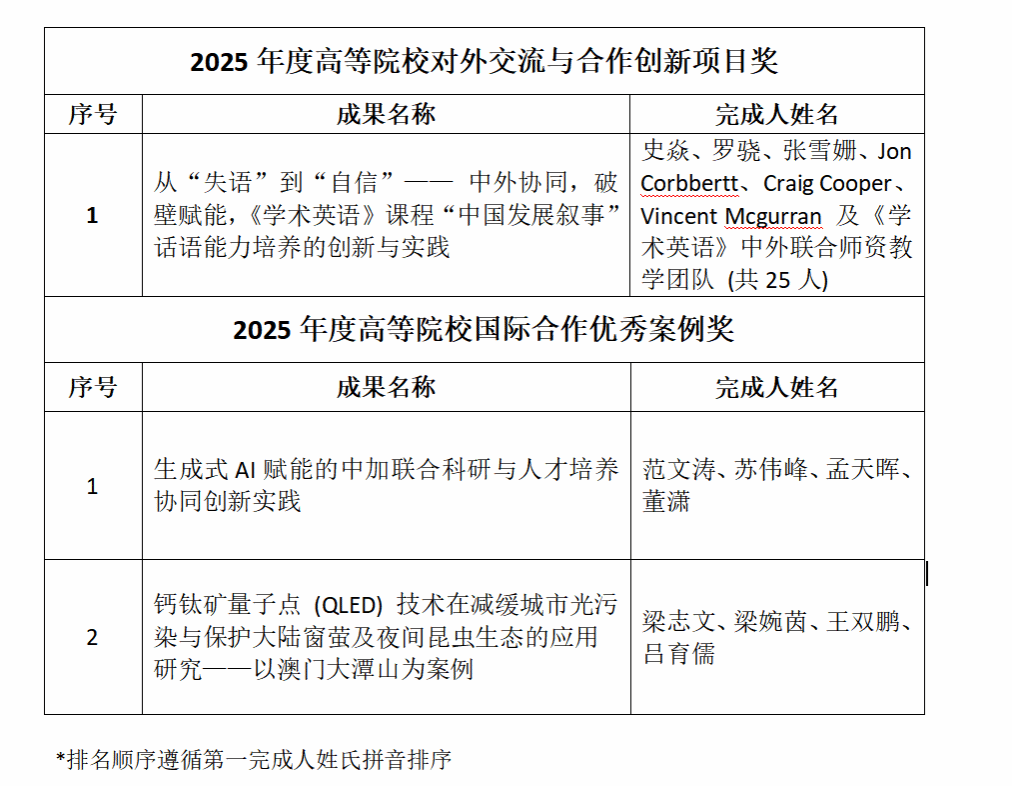 此次获奖项目涵盖两大奖项类别,暨2025年度高等院校对外交流与合作创新项目奖和2025年度高等院校国际合作优秀案例奖。获奖名单如下: