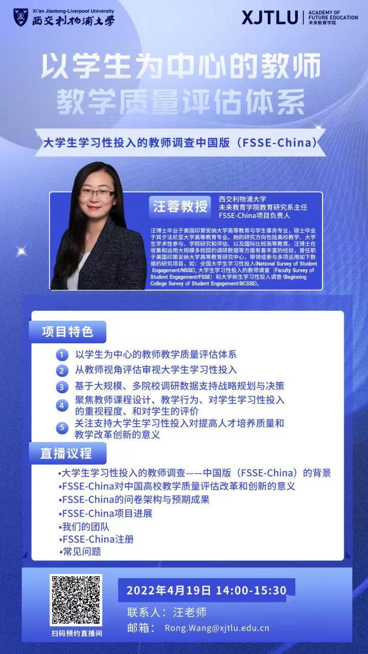 Speaker: Prof. Rong Wang 汪蓉 教授 (Head of the Department of the Educational Studies in the Academy of Future Education at XJTLU, Faculty Survey of Student Engagement (FSSE)-China Principal Investigator)