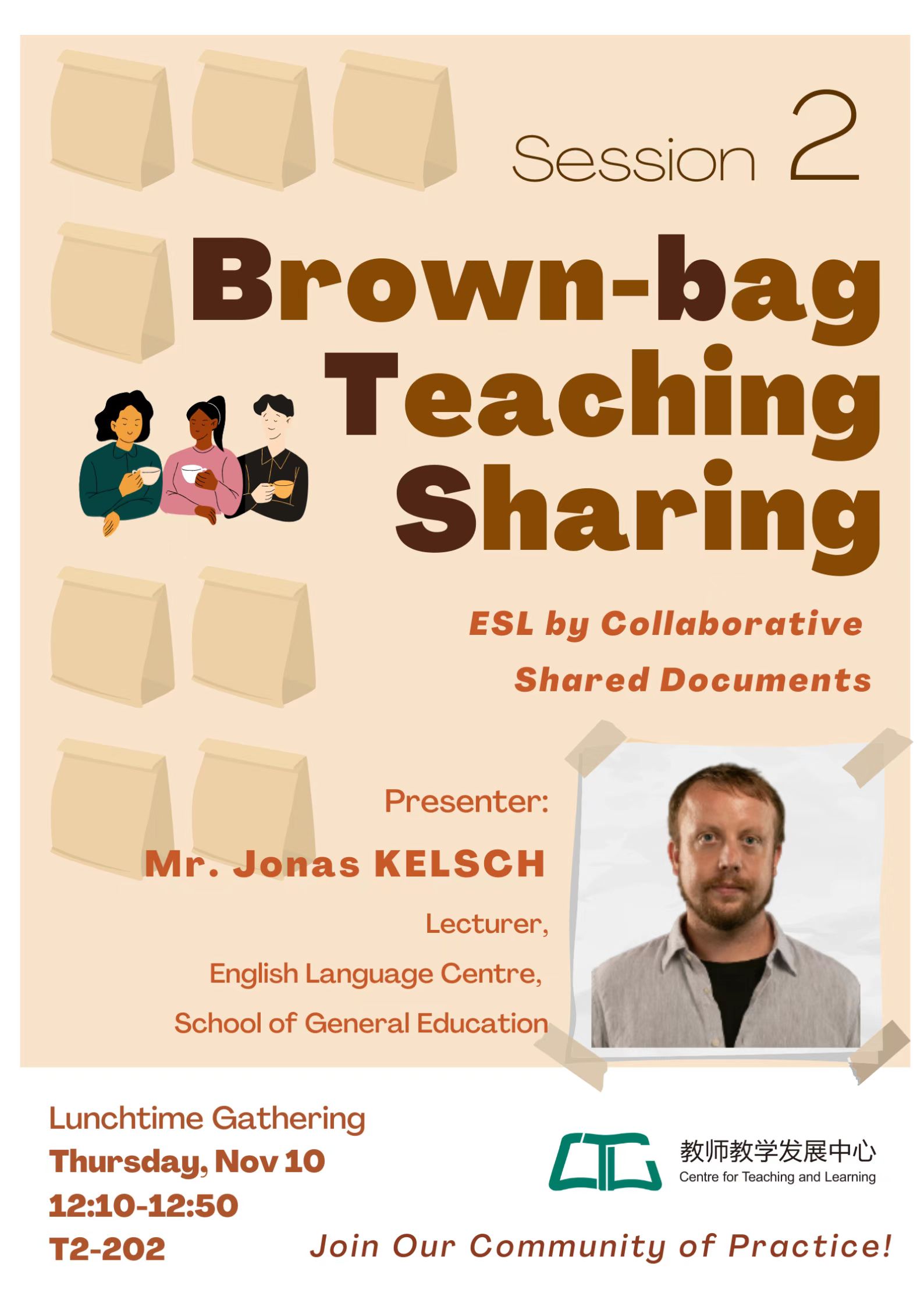 | Sharing | Brown Bag Teaching SharingESL by Collaborative Shared Documents Thursday, November 10, 2022; 12:10 - 12:50 PM | T2-202 Open to Teaching/Teaching support staff