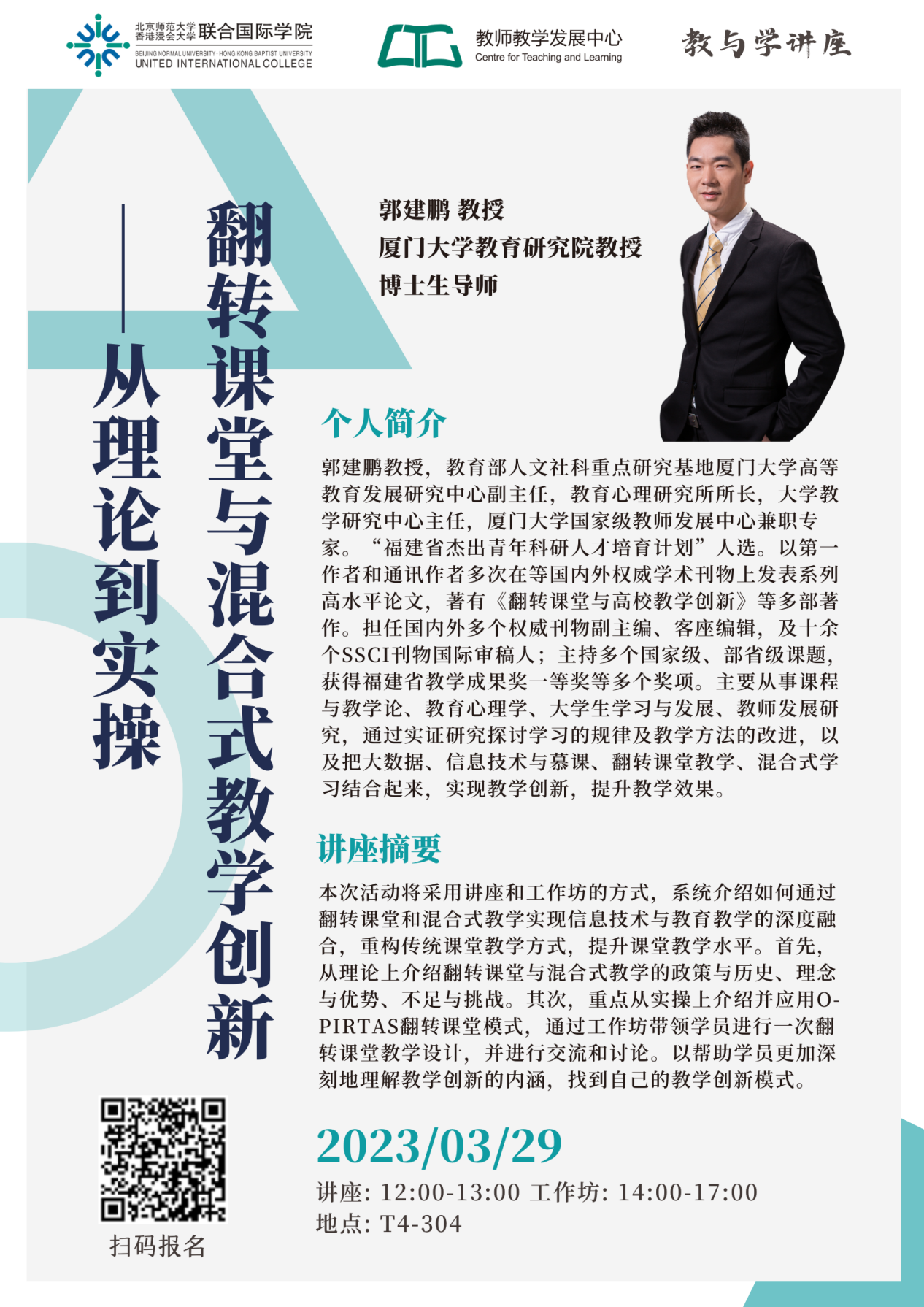 Presenter: Prof. Jianpeng Guo, Institution of Education, Xiamen University 厦门大学教育研究院郭建鹏教授 (博士生导师、高等教育发展研究中心副主任,教育心理研究所所长,大学教学研究中心主任,厦门大学国家级教师发展中心兼职专家。“福建省杰出青年科研人才培育计划”人选) Language: Mandarin Eligibility: Teaching/Teaching support staff