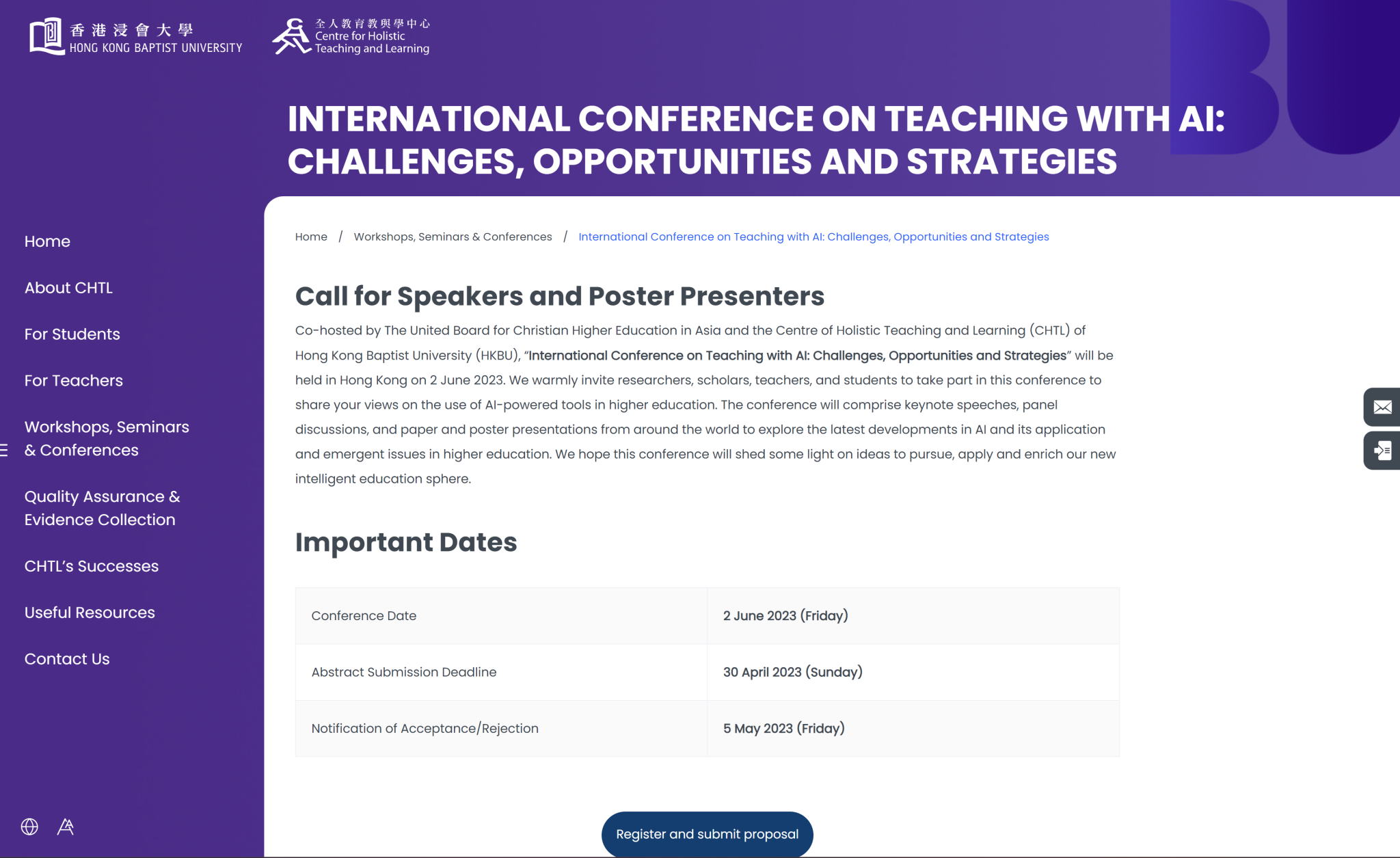 Organizer: The United Board for Christian Higher Education in Asia, the Centre of Holistic Teaching and Learning (CHTL) of Hong Kong Baptist University (HKBU) Date: 2 June 2023 (Friday) Venue: Hong Kong Abstract Submission Deadline: 30 April 2023 (Sunday) Notification of Acceptance/Rejection: 5 May 2023 (Friday)
