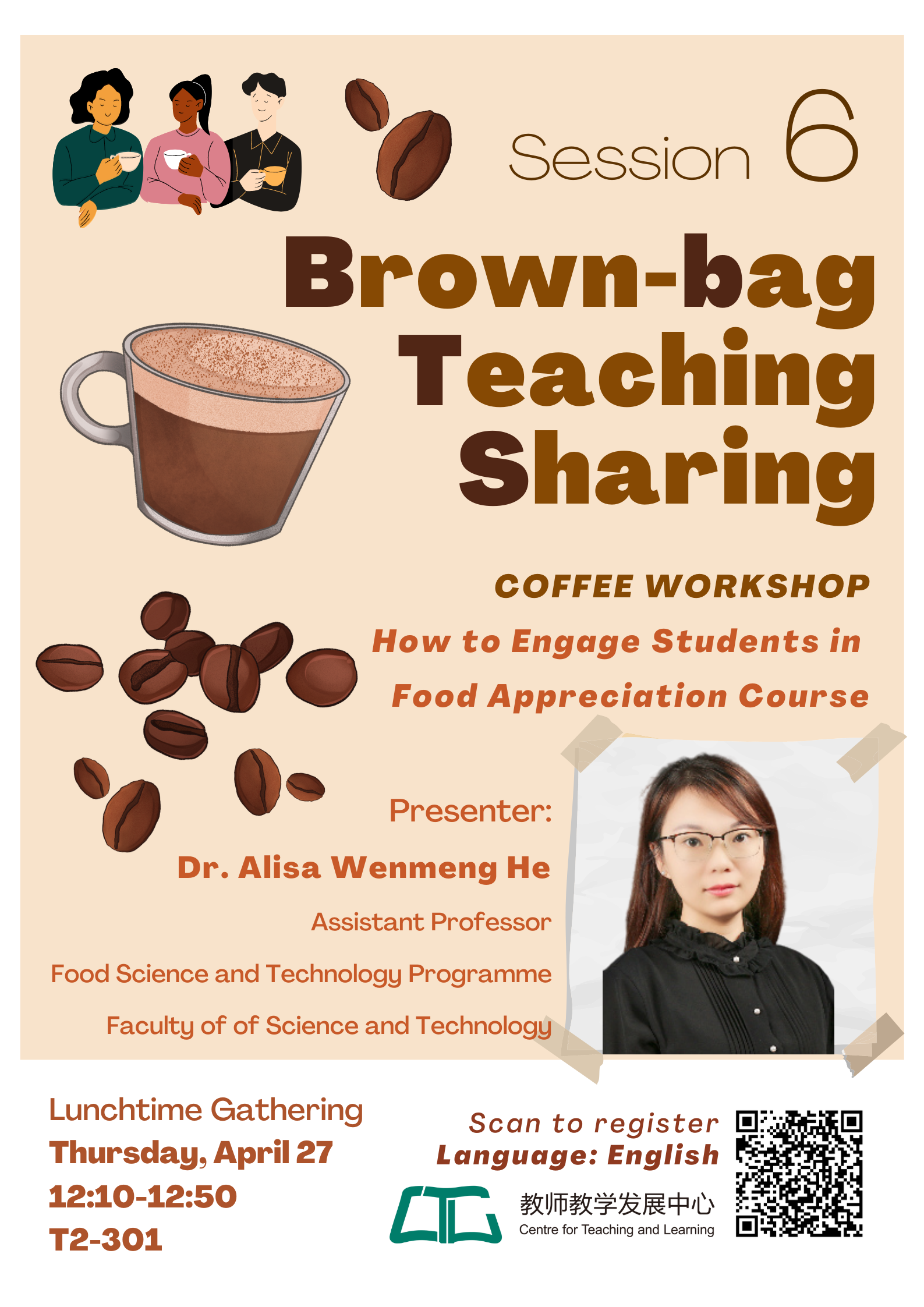 | Date &Time: 12:10 - 12:50, April 27 (Thu), 2023 Topic: COFFEE WORKSHOP-How to Engage Students in FOOD 1013 Food Appreciation Course Presenter: Dr. Alisa Wenmeng He (Assistant Professor, Food Science and Technology Programme, Faculty of of Science and Technology) Venue: T2-301 Language: English Eligibility: Teaching/Teaching support staff Registration: scan the QR code on the poster or click Here to register before 9 am, April 27