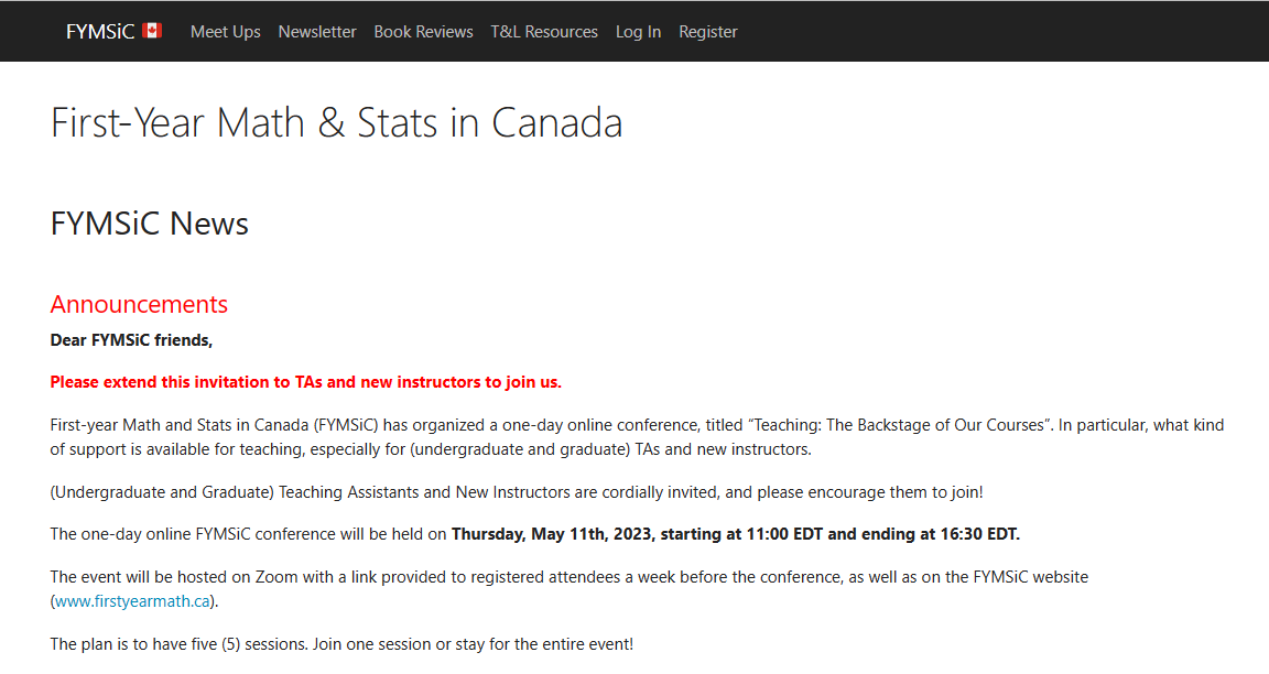 | FYMSiC Online Conference | Teaching: The Backstage of Our Courses Organizer: First-year Math and Stats in Canada (FYMSiC) Targeted: (Undergraduate and Graduate) Teaching Assistants and New Instructors Date: May 11, 2023 Venue: via Zoom (link will be provided to registered attendees a week before the conference) Registration (DDL: May 5): click Here to register