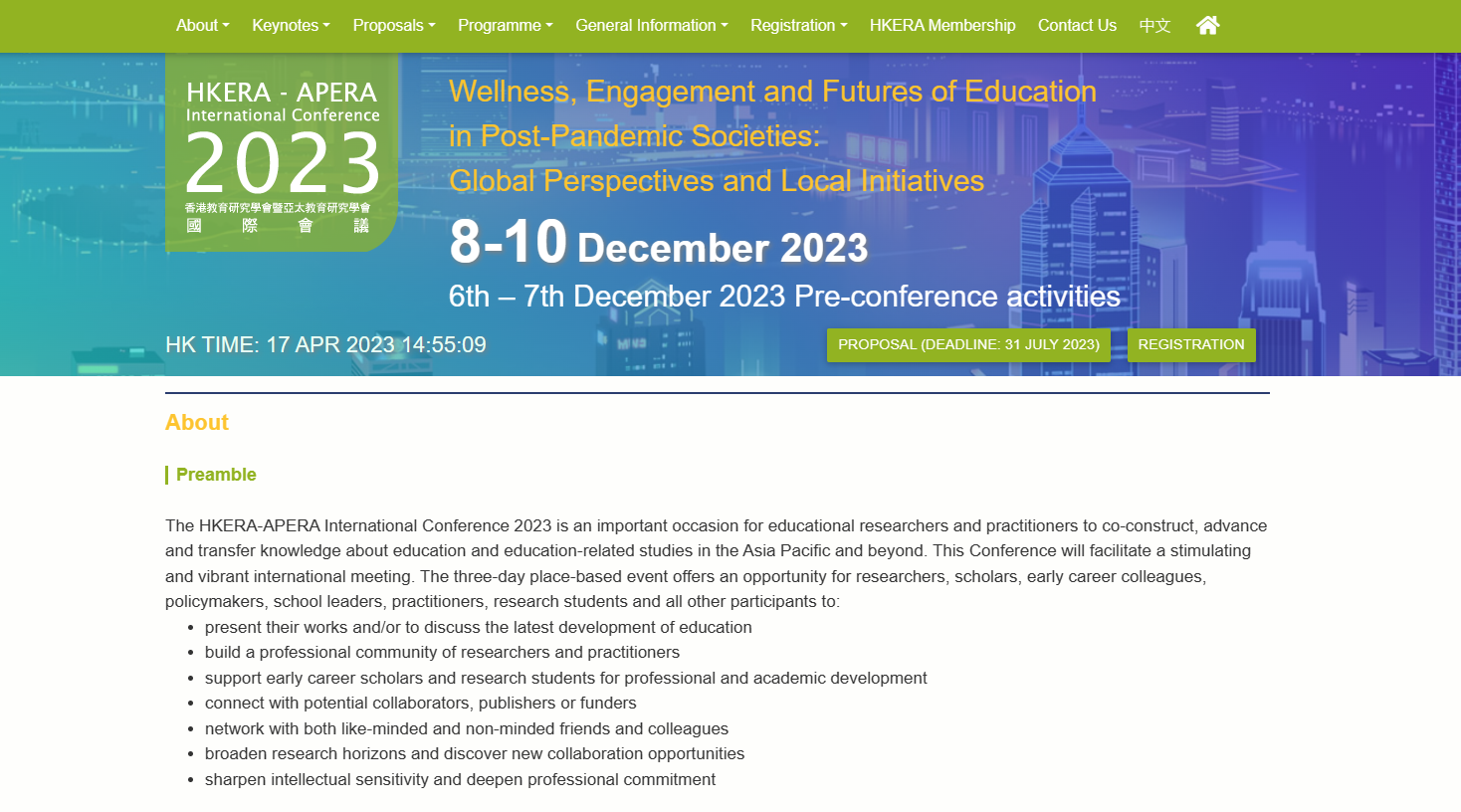 | Date: Dec 8-10, 2023 Theme: Wellness, Engagement and Futures of Education in Post-Pandemic Societies: Global Perspectives and Local Initiatives Proposal Deadline: July31, 2023 Venue: CUHK Language: English, Putonghua, or Cantonese The conference language should be English and Chinese (including Mandarin and Cantonese). The abstract language must be consistent with the presentation language. Agreement of the audience is needed if presentation language is to be changed.