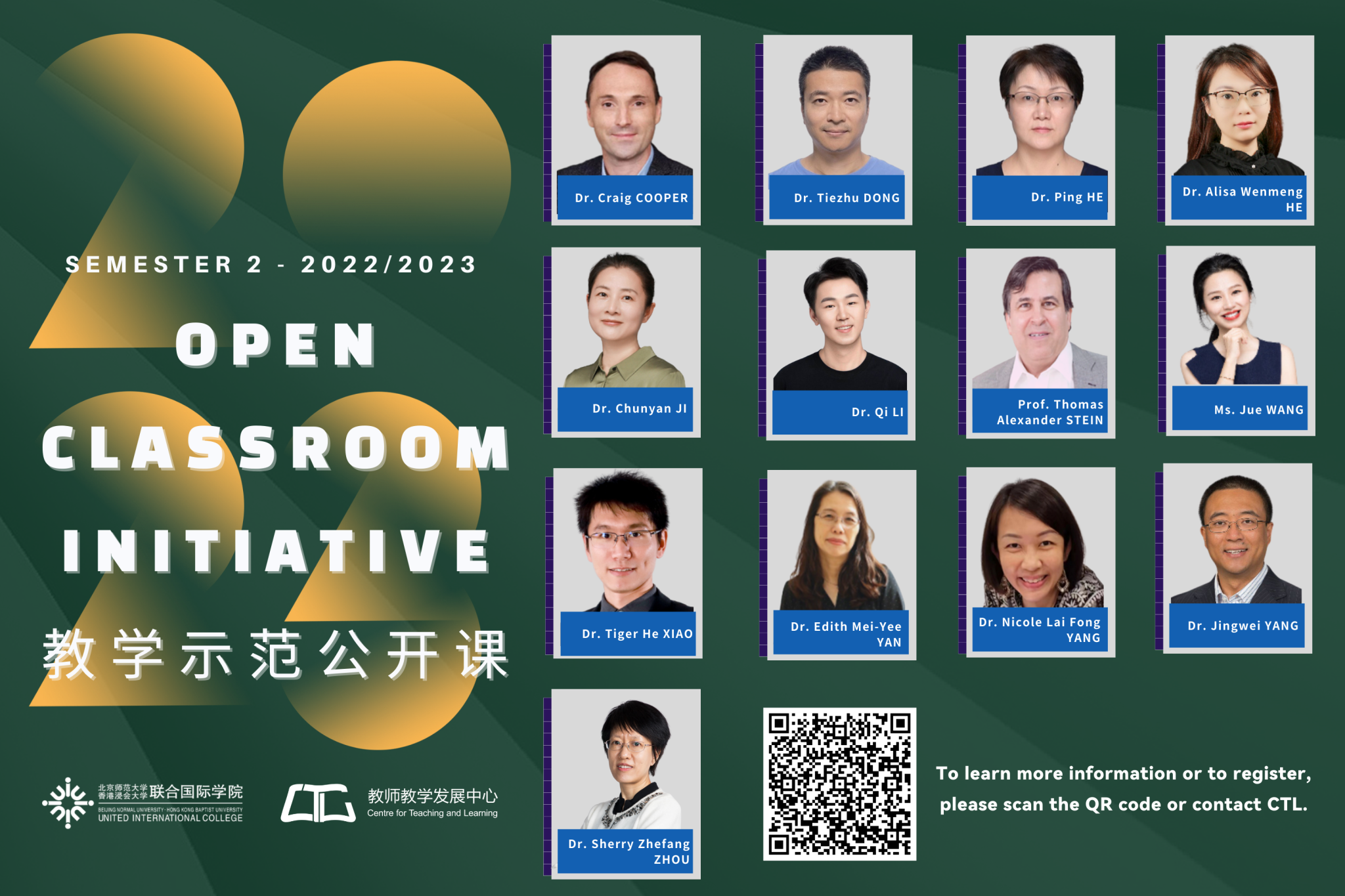 | Open Classroom Initiative (Semester 2 of Academic Year 2022-23) To promote teaching excellence at UIC, "Open Classroom Initiative" (OCI) is launched to provide colleagues a safe space to learn and develop innovative and technological pedagogical practices from the exemplary colleagues who have demonstrated teaching excellence in their courses. If you would like to observe the participating courses, please register and choose the available timeslot in advance. After receiving the registration, CTL will inform the course instructors and participants via email.