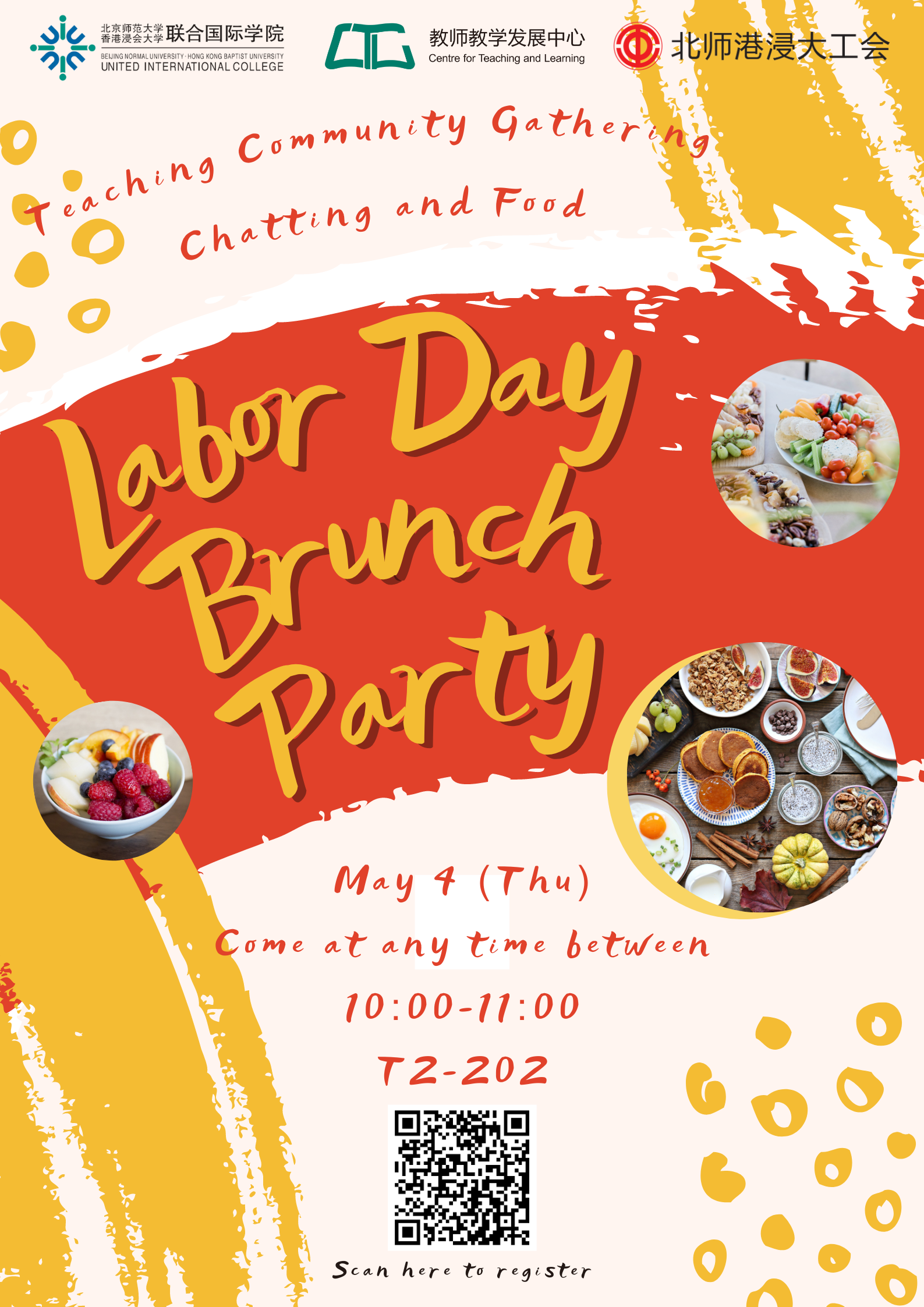 Labor Day Brunch Party Date & Time: 10:00 - 11:00 am, May 4 (Thu), 2023 Venue: T2-202 Eligibility: Teaching/Teaching support staff Registration: scan the QR code on the poster or click the button below to register before 3 pm, May 3