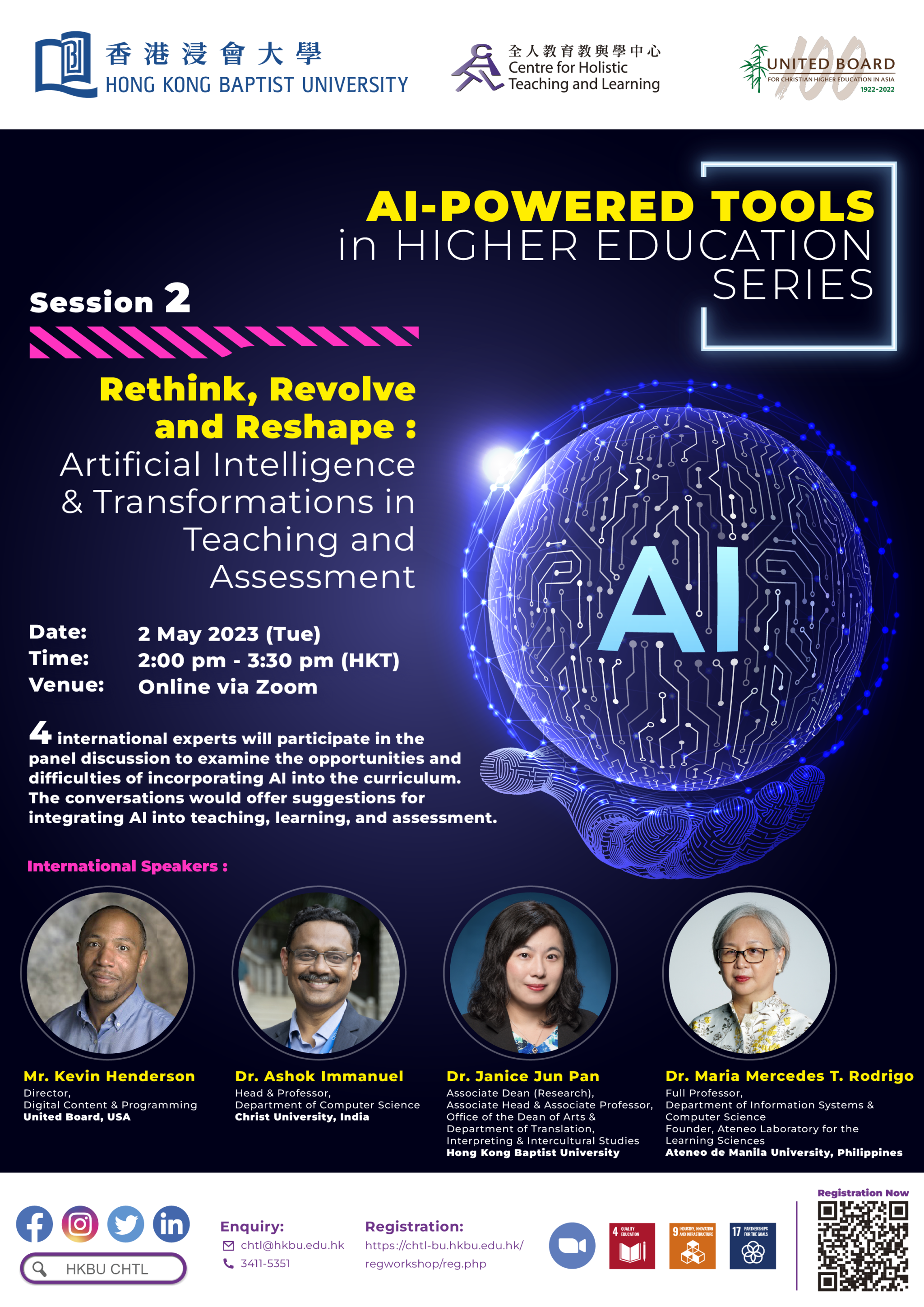 Rethink, Revolve and Reshape: Artificial Intelligence & Transformations in Teaching and Assessment Date & Time: 2:00 pm–3:30 pm, 2 May (Tue), 2023 (Hong Kong Time) Venue: Online via Zoom Presenter: Mr. Kevin HENDERSON (Director, Digital Content and Programming, United Board, USA)