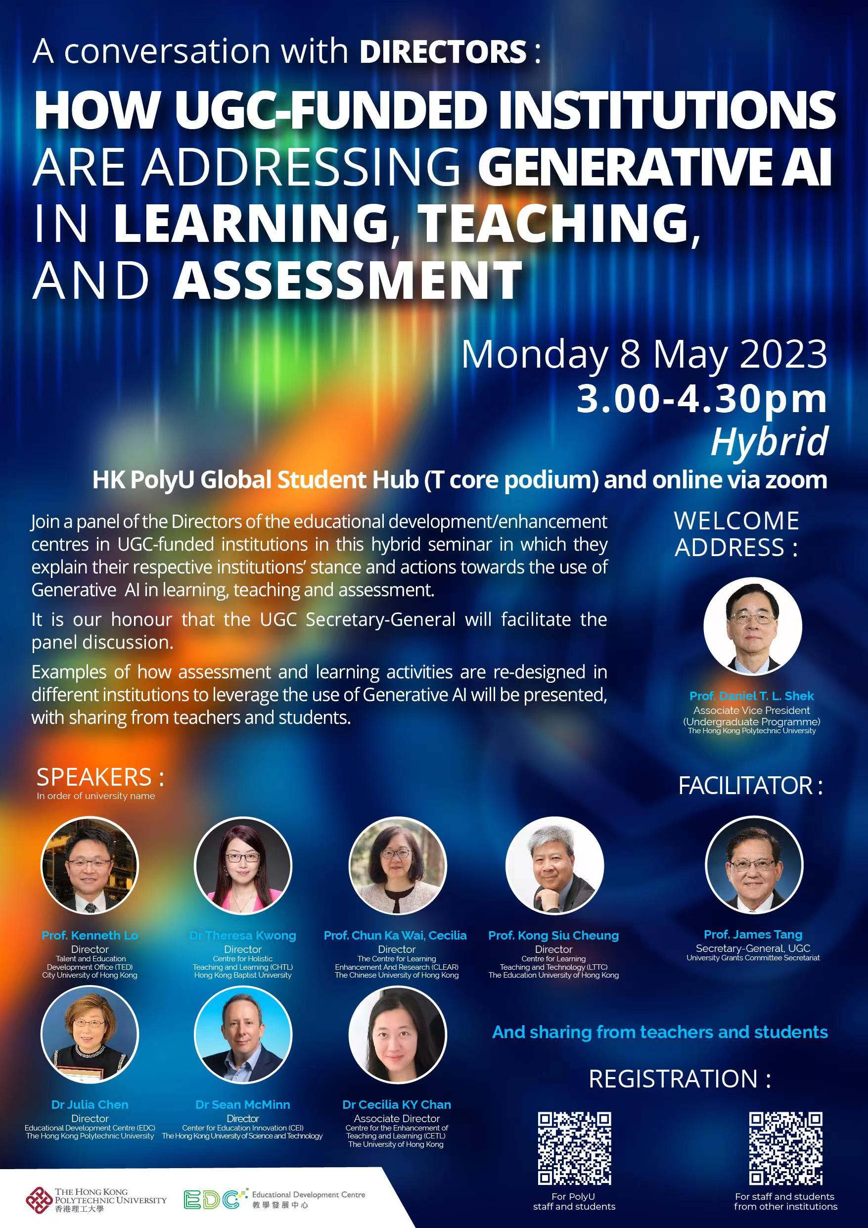 | A Conversation with Directors: How UGC-funded Institutions are Addressing Generative AI in Learning, Teaching and Assessment Date & Time: 3:00 pm–4:30 pm, 8 May (Mon), 2023 Venue: Online via Zoom Facilitator: Prof. James Tang, Secretary-General, University Grants Committee Speakers: Prof. Kenneth Lo, Director, TED, CityU Dr Theresa Kwong, Director, CHTL, HKBU Prof. Chun Ka Wai, Cecilia, Director, CLEAR, CUHK Prof. Kong Siu Cheung, Director, LTTC, EDUHK Dr Julia Chen, Director, EDC, PolyU Dr Sean McMinn, Director, CEI, HKUST Dr Cecilia KY Chan, Associate Director, CETL, HKU