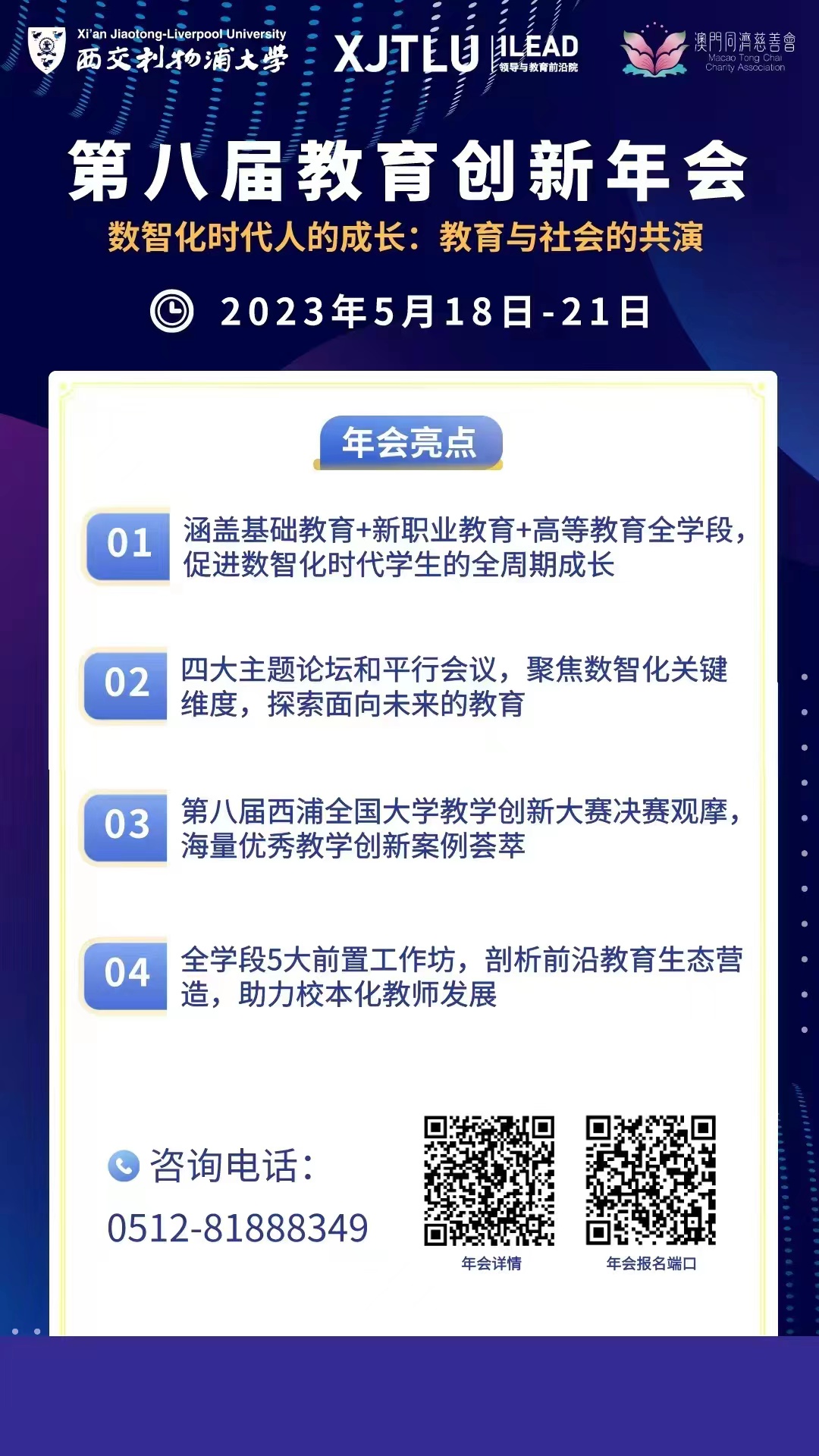 | The 8th Annual Conference For Higher Education Innovation and the 10th Wisdom-lake Higher Education Internalization Forum 2023 第八届教育创新年会暨第十届慧湖教育国际化论坛 Organizer: The Institute of Leadership and Education Advanced Development (ILEAD), Xi'an Jiaotong-Liverpool University Date: May 18-21, 2023 Location: Xi'an Jiaotong-Liverpool University 西交利物浦大学