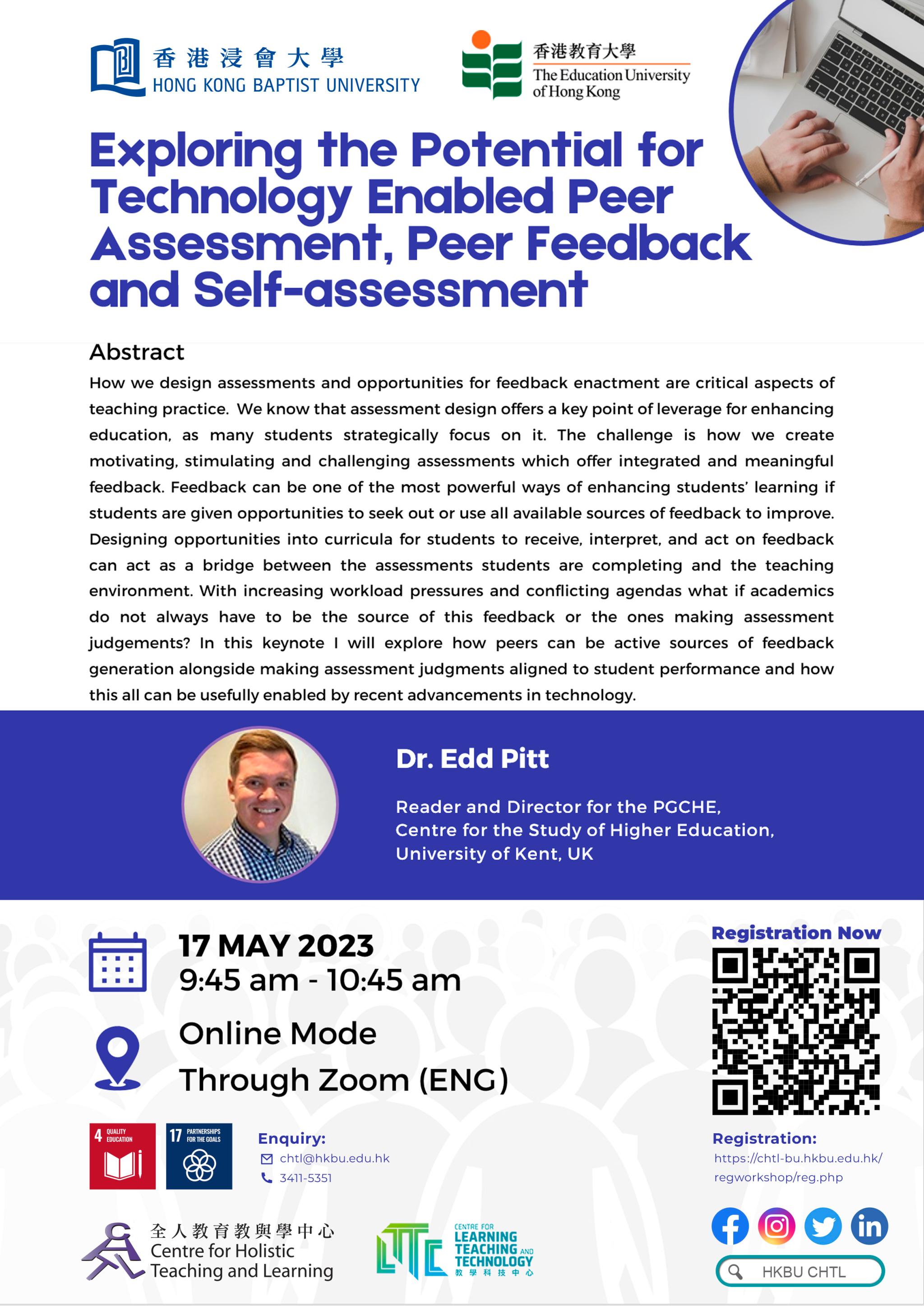 TALES 7 - Exploring the Potential for Technology Enabled Peer Assessment, Peer Feedback and Self-assessment Date & Time: 9:45 am–10:45 am, 17 May (Wed), 2023 (Hong Kong Time) Venue: Online via Zoom Presenter: Dr. Edd Pitt (Reader and Director for the PGCHE, Centre for the Study of Higher Education, University of Kent, UK)
