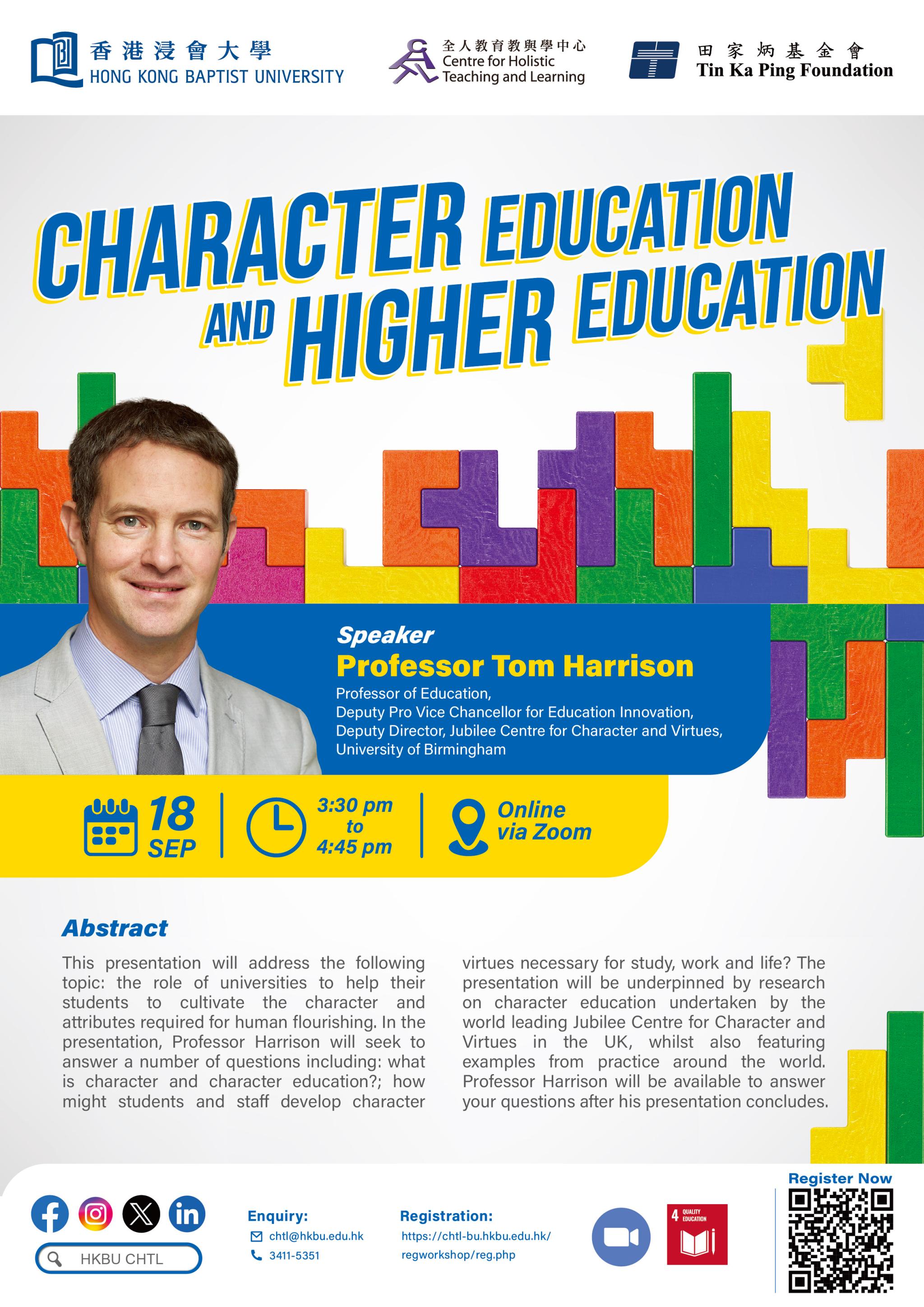 Date: September 18 (Mon), 3:30 pm - 4:45 pm Speaker: Prof. Tom HARRISON (Professor of Education, Deputy Pro Vice Chancellor for Education Innovation, Deputy Director, Jubilee Centre for Character and Virtues, University of Birmingham) Venue: Online via Zoom Abstract: This presentation will address the following topic: the role of universities to help their students to cultivate the character and attributes required for human flourishing. In the presentation, Professor Harrison will seek to answer a number of questions including: what is character and character education?; how might students and staff develop character virtues necessary for study, work and life? The presentation will be underpinned by research on character education undertaken by the world leading Jubilee Centre for Character and Virtues in the UK, whilst also featuring examples from practice around the world. Professor Harrison will be available to answer your questions after his presentation concludes. |