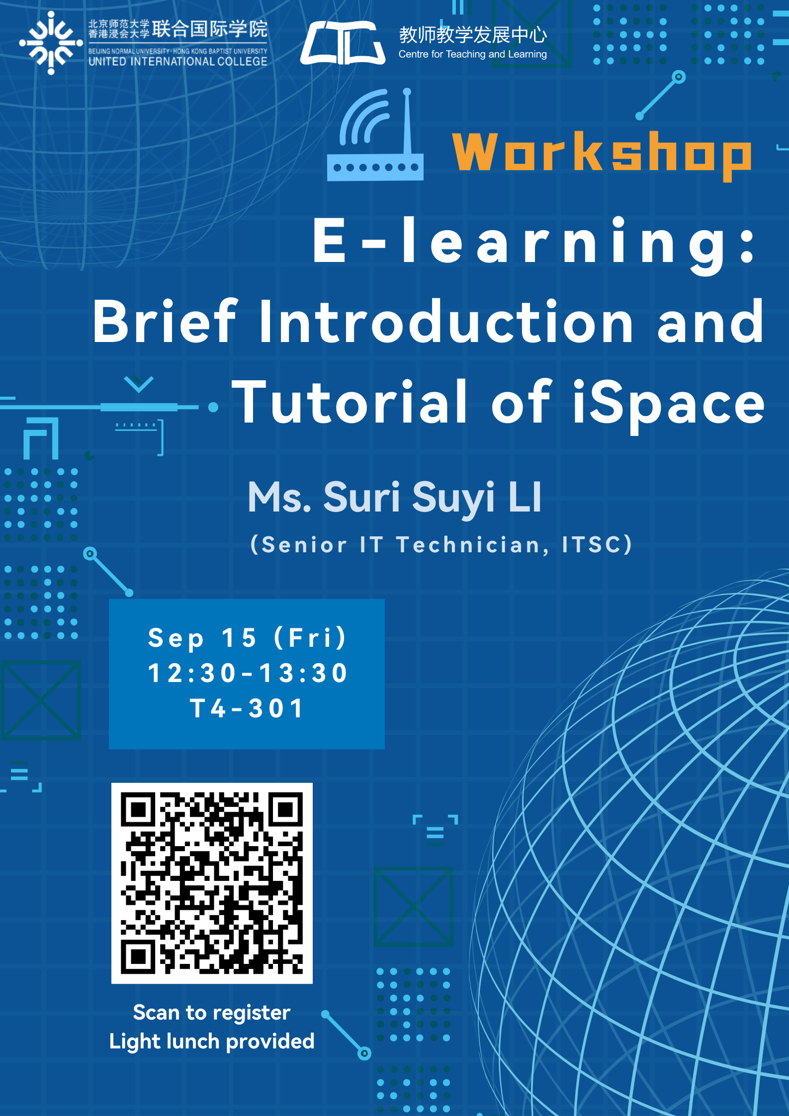 Co-organizer: Information Technology Services Centre (ITSC) Date & Time: 12:30 pm-1:30 pm, 15 September 2023 Speaker: Ms. Suri Suyi LI (Senior IT Technician, ITSC) Venue: T4-301 Language: English Abstract: At the end of the workshop, you will be able to know: 1. What is iSpace/Moodle 2. How to login to iSpace 3. How to prepare courses in iSpace 4. More tutorial resources and contact information Registration (DDL:15 Sep, 9 am): click Here Light lunch will be provided. |