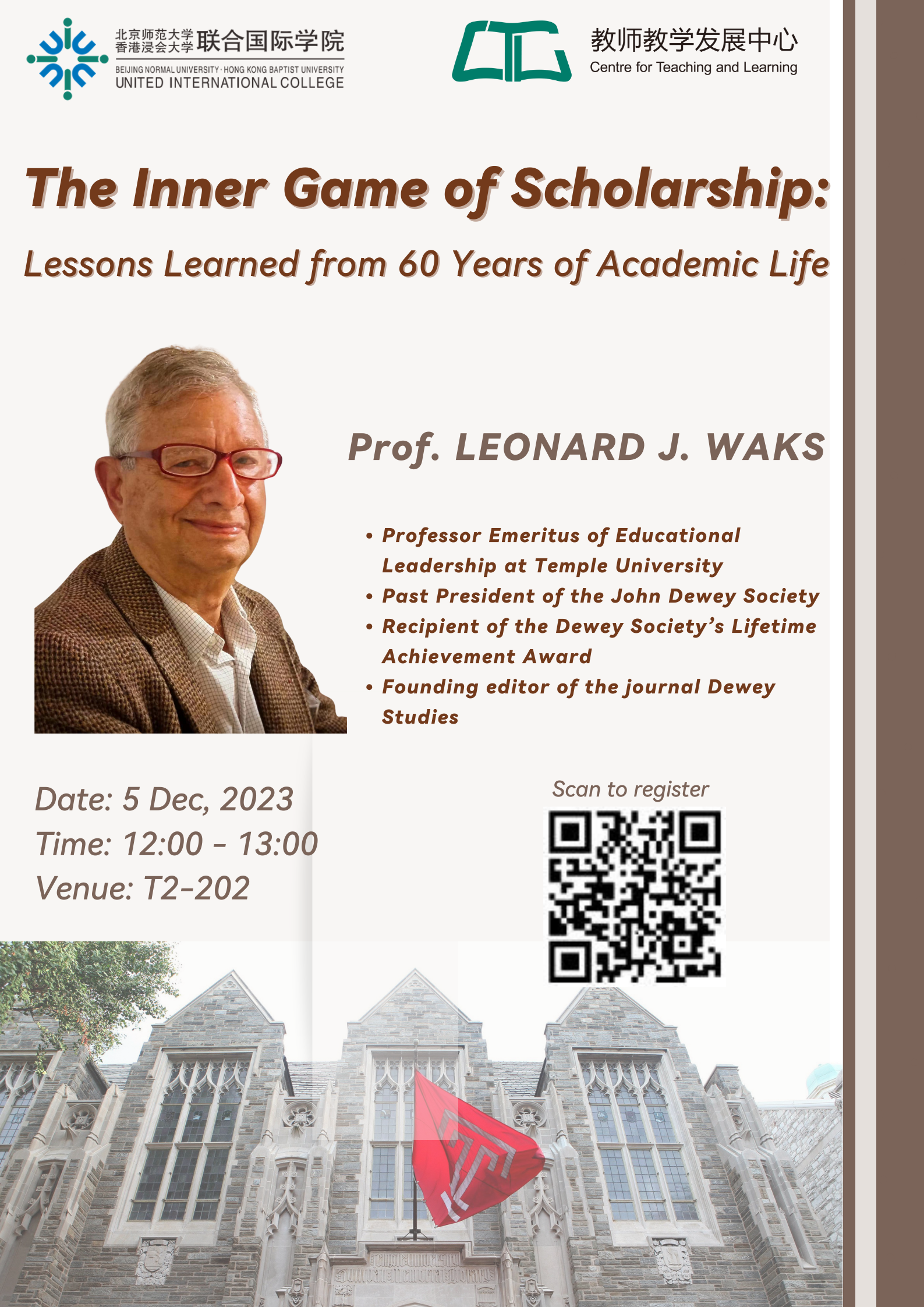 Date & Time: 19:00 - 20:30, Dec 4 (Mon), 2023 Presenter: Prof. Leonard J. Waks (Professor Emeritus of Educational Leadership at Temple University; Past President of the John Dewey Society; Recipient of the Dewey Society’s Lifetime Achievement Award; Founding editor of the journal Dewey Studies) Language: English Venue: T2-102