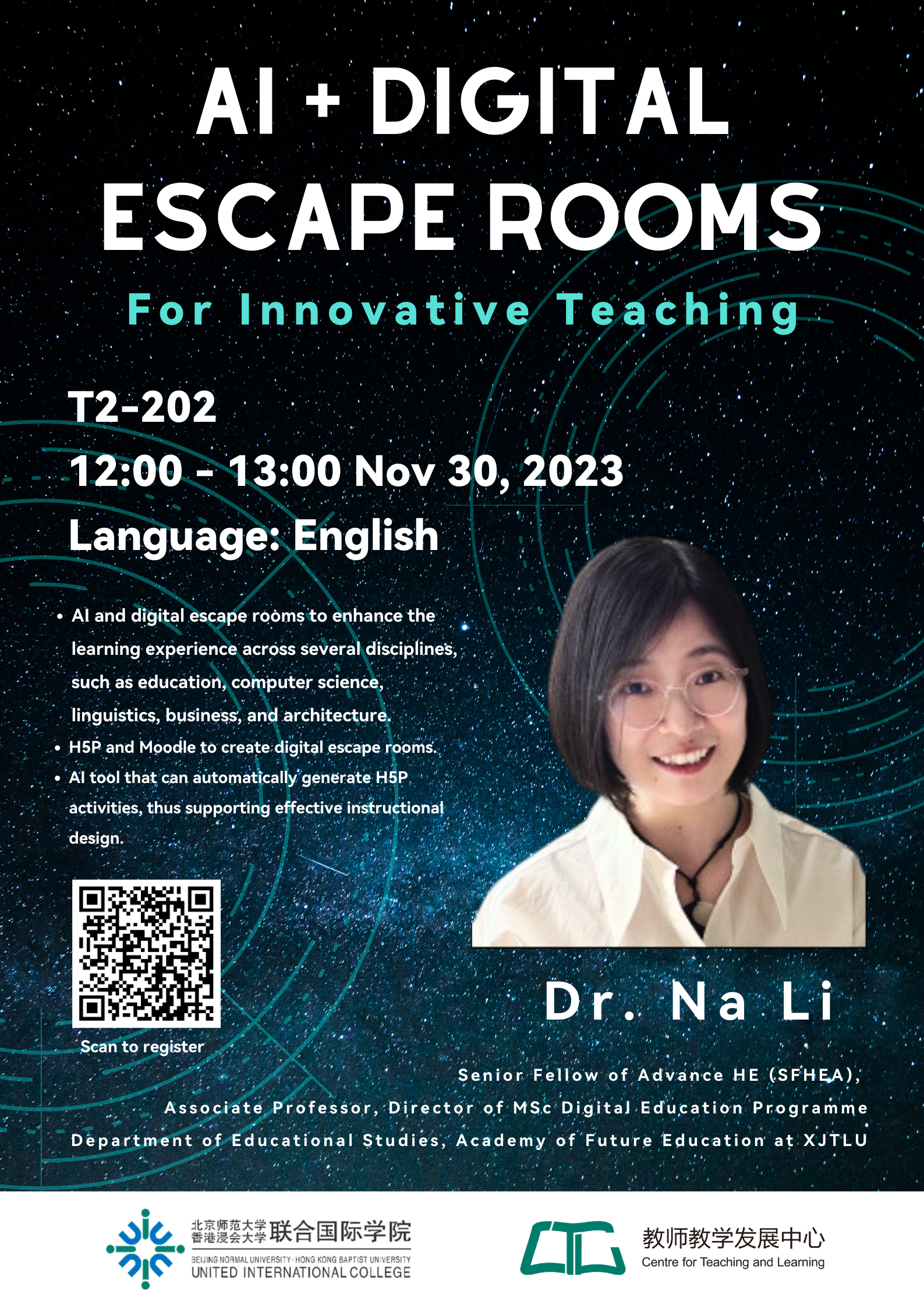 If you have any confusion or inquiries on teaching practices, teaching contests or award applications, please contact Ms. Sandy Chen via email (sandychen@bnbu.edu.cn) to schedule an appointment with Prof. Lin in advance. The detailed arrangement will be informed via email after successful registration.