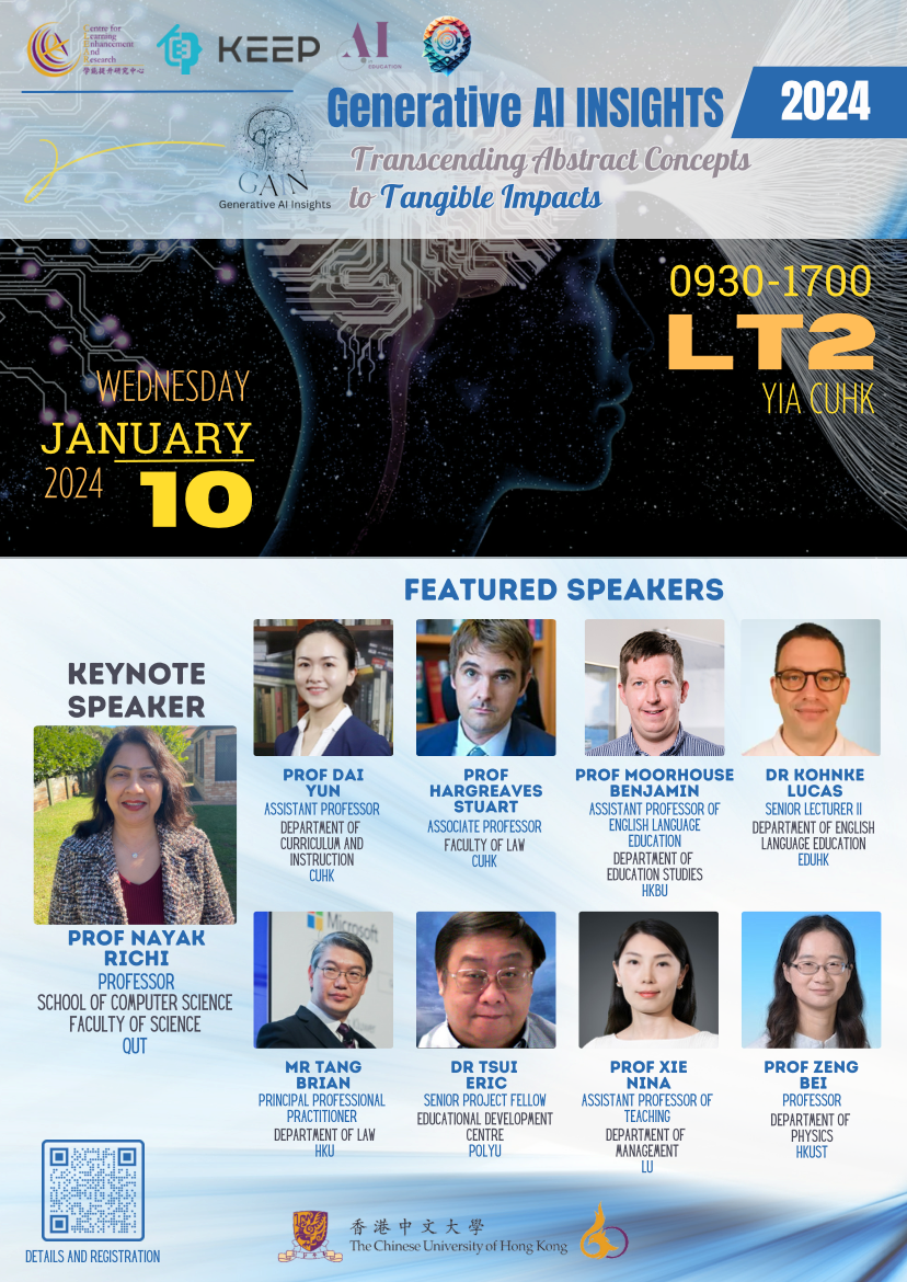 Date: January 10, 2024 (Wednesday) Time: 9:30 am - 5:00 pm (Hong Kong Time) Host: Centre for Learning Enhancement And Research of The Chinese University of Hong Kong Venue: LT2, G/F, Yasumoto International Academic Park (YIA), The Chinese University of Hong Kong / Online via Zoo Format: Hybrid conference Target Audience: All academics, researchers, professionals, and students Language: English Contact: ai-in-education@cuhk.edu.hk Abstract: The "Generative AI Insights (GAIN) 2023" conference held in early June to share high-level insights into generative AI policies and practices with our passionate educators and students. Building upon its success, the Centre for Learning Enhancement and Research of CUHK seeks to deepen participants' understanding of the real-world applications of generative AI technologies in teaching and learning through practice- and research-focused presentations at the upcoming conference. With these evidence-based knowledge-sharing sessions, the "Generative AI Insights (GAIN) 2024" conference aims to inspire, connect, and empower academics and researchers to foster a collaborative community to drive continuous innovations and advancements in AI education and research. Registration: Click Here |